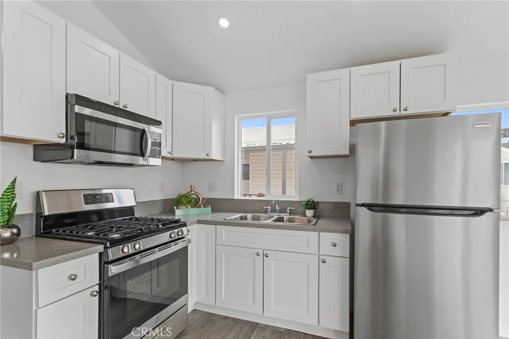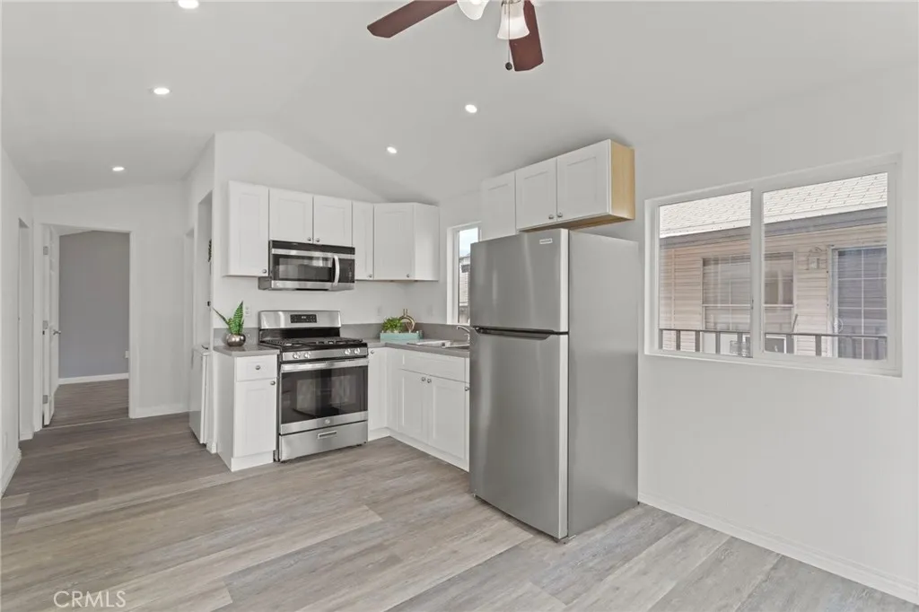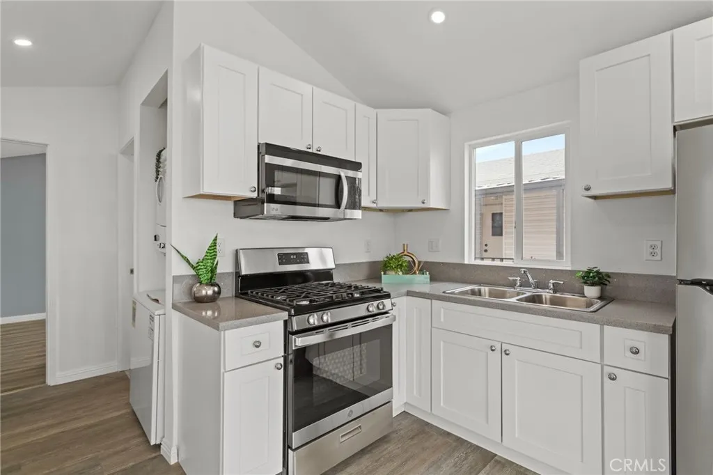 Welcome to this completely renovated and move-in ready manufactured home offering approximately 480 square feet of thoughtfully updated living space in the established Orange Grove Mobile Home Park of Covina. This refreshed residence features 1 bedroom and 1 bathroom, blending modern upgrades with comfortable everyday living. Step inside to discover a bright and open interior enhanced by durable vinyl plank flooring, fresh paint, and recessed LED lighting. The stylish kitchen has been tastefully remodeled with white shaker cabinetry, sleek Corian countertops, a deep single-basin sink, and all appliances included for convenience. A dedicated laundry area with washer and dryer hookups adds practical functionality. The well-proportioned bedroom provides natural light and flexible space for rest or personal use, while the updated bathroom features contemporary fixtures and finishes that complement the homes clean aesthetic. Additional features include a covered patio, perfect for relaxing or entertaining outdoors, and an efficient mini-split heating and cooling system that ensures year-round comfort. Residents of Orange Grove Mobile Home Park enjoy access to a beautiful community pool, well-kept common grounds, and a welcoming neighborhood environment. Conveniently located near major freeways, shopping, and dining, this home offers both accessibility and comfort. This property presents a rare opportunity to own a fully renovated, move-in ready home with modern finishes in a desirable manufactured home community. Schedule your showing today to experience everything this home has