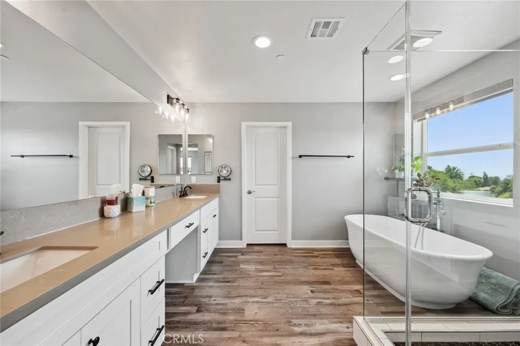 Seller is Motivated!! Welcome to your private retreat that sits on the end of a quiet Cul-de-Sac! NO HOA, gated RV parking complete with hookups, and OWNED SOLAR! Boasting with 4 spacious bedrooms and 4 luxurious bathrooms, this home is perfect for growing families, multi-generational living, or anyone craving extra space. Imagine welcoming guests or family into the private main-floor guest suite, a true retreat with its own entrance and bathroom, ideal for in-laws or long-term guest. The kitchen is every chef's dream! Including a central island, the kitchen has plenty of counterspace, soft closing cabinetry, high end appliances, walk in pantry. An adjacent office nook offers the perfect spot for remote work, homework, or managing household tasks, all while staying connected to the welcoming open living room centered around a charming fireplace with laminate wood floors with large windows that fill the space with natural light, creating an inviting ambiance for every season. Upstairs, retreat to your private oasis in the expansive primary suite. The room is finished with carpeting that elevated the sense of comfort, abundant natural light, and a spa-inspired primary bathroom featuring a soaking tub, a large step-in shower with a seating bench, dual vanities, and an oversized walk-in closet that will satisfy the most discerning fashion lover. Two additional large bedrooms, each with walk-in closets, share a beautifully appointed full bath with double sinks, perfect for kids, guests, or a growing household. Laundry day becomes a breeze with a generously sized upstairs laundry