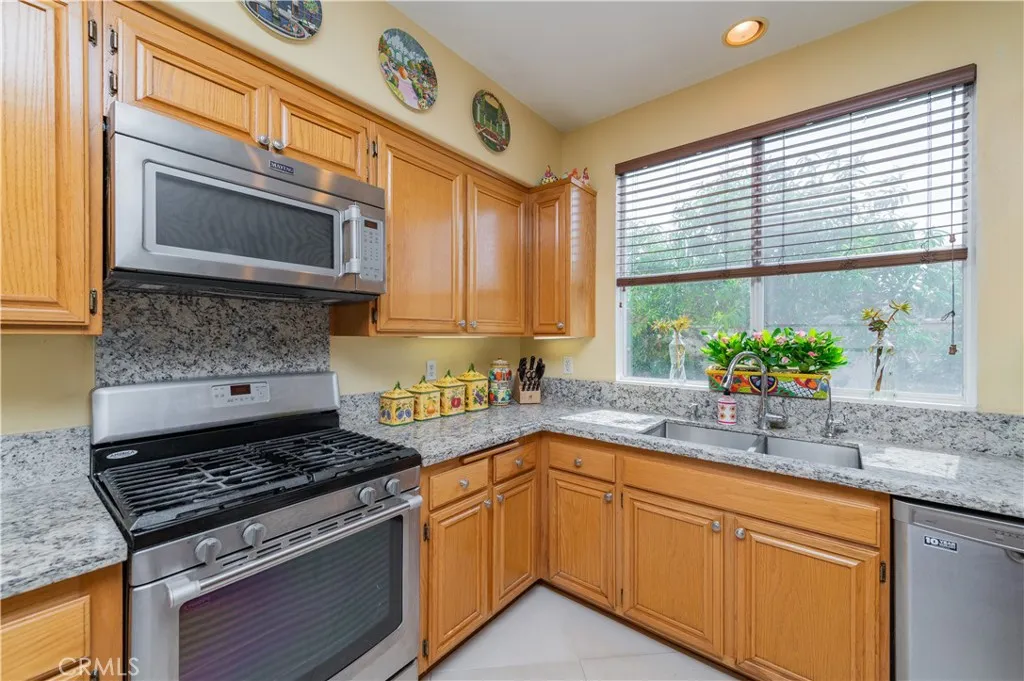 Beautifully maintained 4-bedroom, 2.5-bathroom single-family home situated on a spacious corner lot with great curb appeal and a welcoming front porch. This bright and airy home features marble tile flooring throughout the first floor and warm wood flooring from the stairs through the entire second level. All four bedrooms are located upstairs, offering privacy and comfort for the whole family. The upgraded gourmet kitchen with granite countertops, a large center island, built-in microwave, stainless steel appliances, and custom cabinetry. The open-concept layout connects the kitchen seamlessly to the family room, while a formal dining room provides an elegant space for entertaining. Newly exterior paint, direct access 2-car garage, no HOA fees, no Mello-Roos. Located within walking distance to Zacatecas Park and offering easy access to the 210, 605, and 57 freeways. Bright, stylish, and move-in readydont miss this exceptional opportunity!