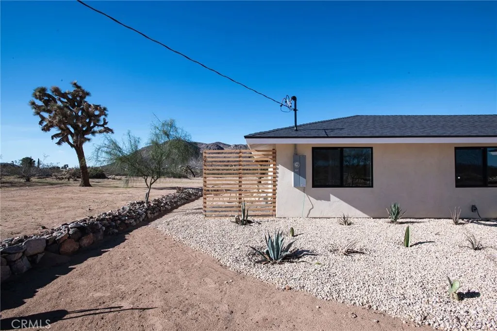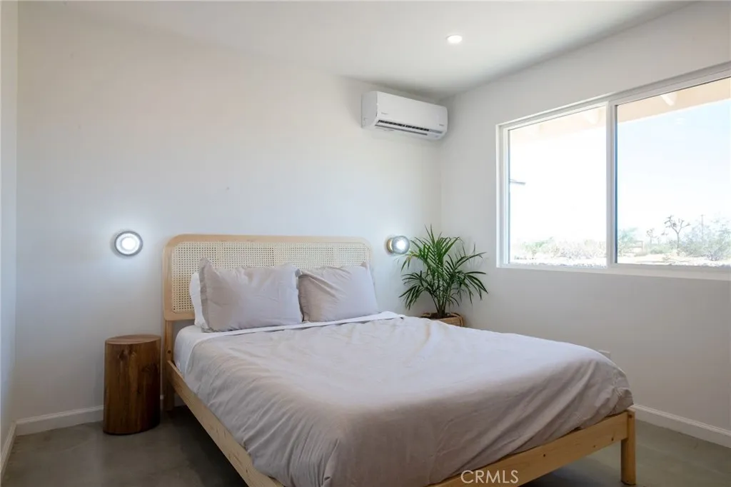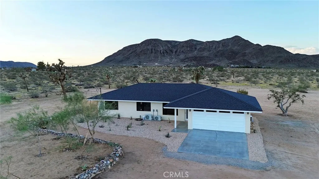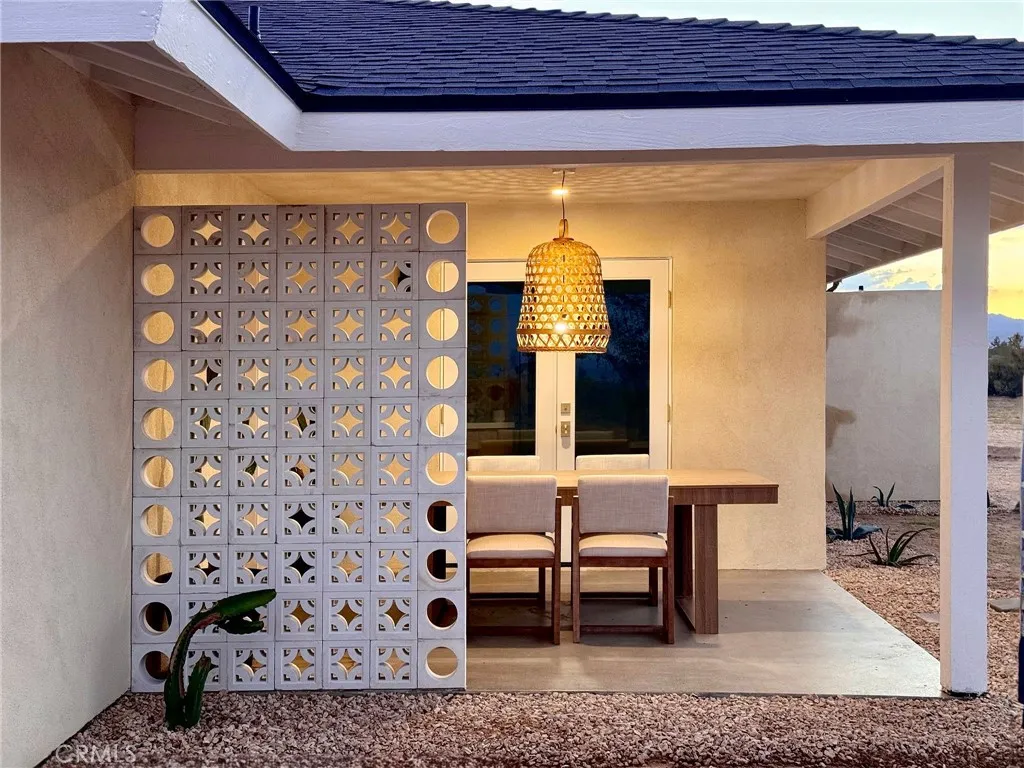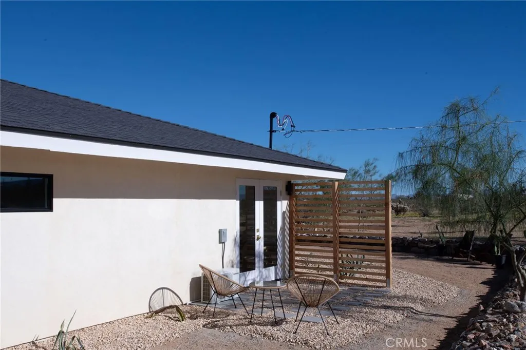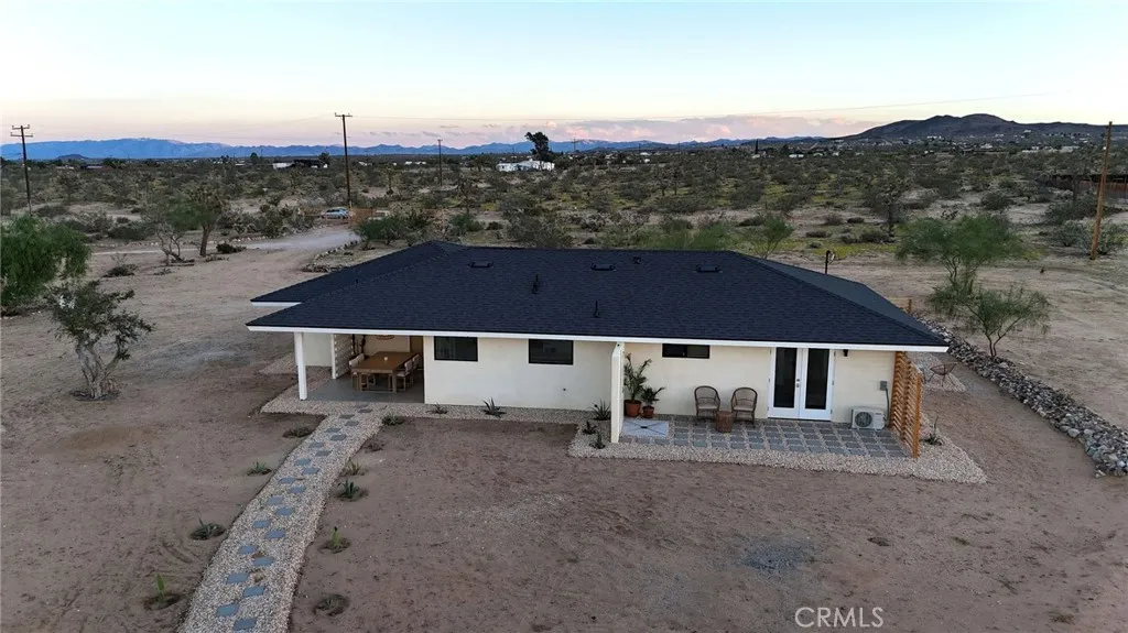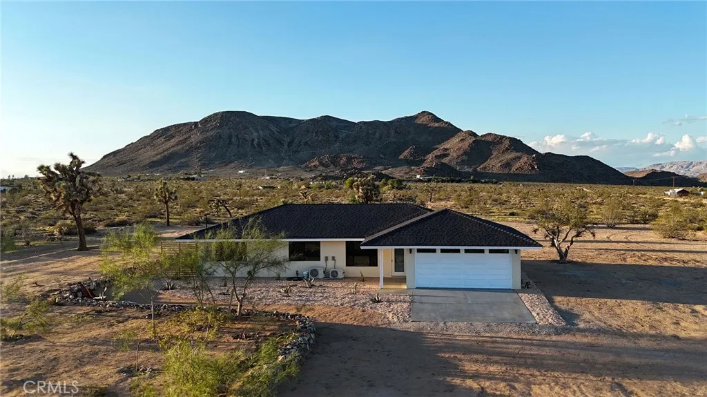 Welcome to 59676 Mitch Rd, where Bohemian Flair meets Desert Elegance. This gorgeous turn-key property has been completely remodeled with every feature intentionally chosen to bring you the perfect airbnb, desert home or weekend retreat. This house showcases 3 bedrooms, 2 bathrooms and 5 ACRES OF LAND with stunning panoramic desert & mountain views. Inside you'll find sleek concrete floors, tasteful decor & furnishings, rounded archways, recessed lighting and large windows that let in an abundance of natural light. The warm and welcoming living room flows effortlessly into the awe-inspiring kitchen and dining area complete with designer-style tile backsplash, bright quartz countertops, beautiful modern cabinetry, high-end FORNO appliances and bar seating. Each bedroom is well appointed with mini-splits for year-round comfortability, closets with custom built-in shelving and 2 of the 3 bedrooms adorn french doors that lead to their own private outdoor patios. Both bathrooms boast spa-like showers with sophisticated tile, glass panels and lovely new vanities with clean, modern finishes. The finished garage has been transformed into the ultimate hangout space equipped with a bar, wine fridge, sink, additional cabinetry, a mini-split and a cozy elevated lounge area (there is even a stacked washer/dryer for added functionality). It doesn't stop there; the serene outdoor living space includes a lovely covered patio for outdoor dining, an outdoor shower with a rainfall shower-head, ample space to entertain or relax around a firepit on a starlit summer night. Not to mention, there
