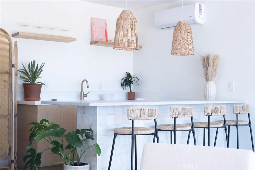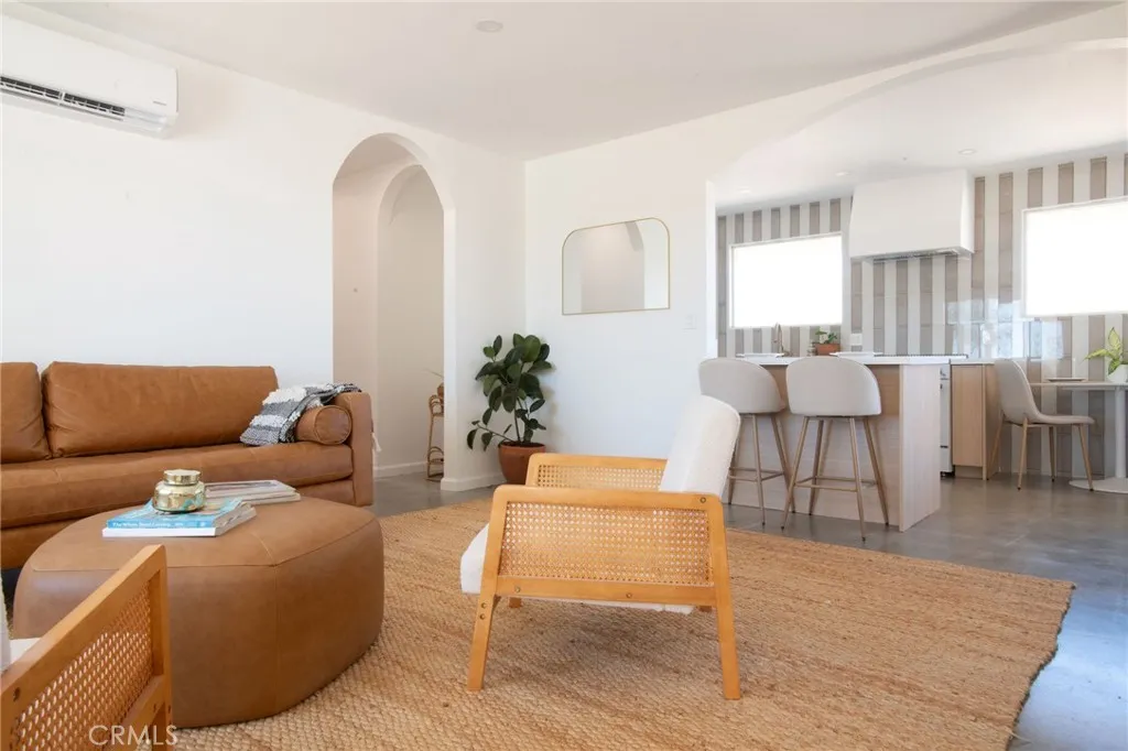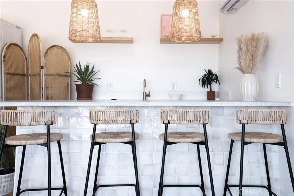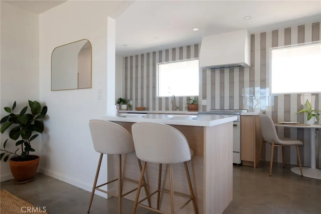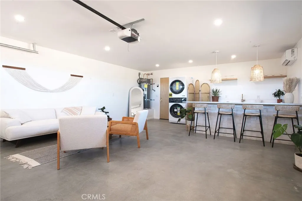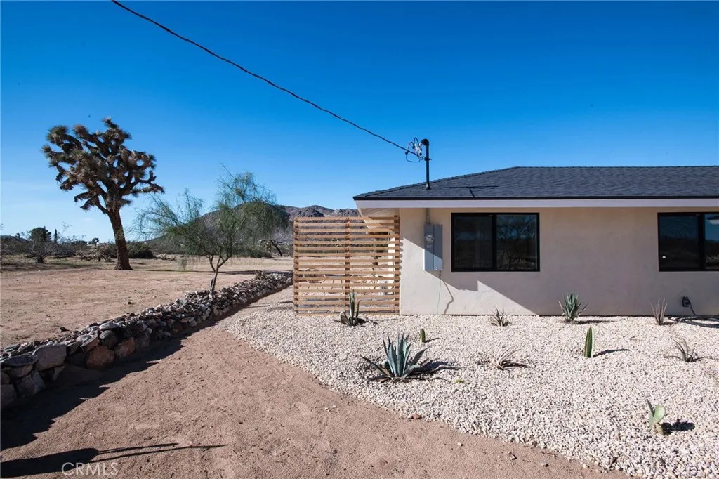 Welcome to 59676 Mitch Rd, where Bohemian Flair meets Desert Elegance. This gorgeous turn-key property has been completely remodeled with every feature intentionally chosen to bring you the perfect airbnb, desert home or weekend retreat. This house showcases 3 bedrooms, 2 bathrooms and 5 ACRES OF LAND with stunning panoramic desert & mountain views. Inside you'll find sleek concrete floors, tasteful decor & furnishings, rounded archways, recessed lighting and large windows that let in an abundance of natural light. The warm and welcoming living room flows effortlessly into the awe-inspiring kitchen and dining area complete with designer-style tile backsplash, bright quartz countertops, beautiful modern cabinetry, high-end FORNO appliances and bar seating. Each bedroom is well appointed with mini-splits for year-round comfortability, closets with custom built-in shelving and 2 of the 3 bedrooms adorn french doors that lead to their own private outdoor patios. Both bathrooms boast spa-like showers with sophisticated tile, glass panels and lovely new vanities with clean, modern finishes. The finished garage has been transformed into the ultimate hangout space equipped with a bar, wine fridge, sink, additional cabinetry, a mini-split and a cozy elevated lounge area (there is even a stacked washer/dryer for added functionality). It doesn't stop there; the serene outdoor living space includes a lovely covered patio for outdoor dining, an outdoor shower with a rainfall shower-head, ample space to entertain or relax around a firepit on a starlit summer night. Not to mention, there