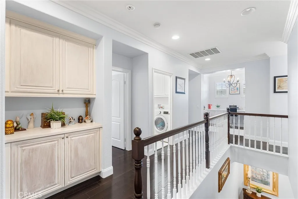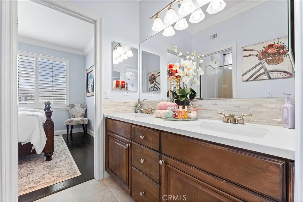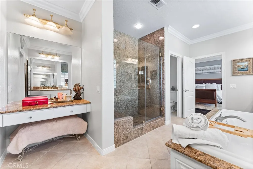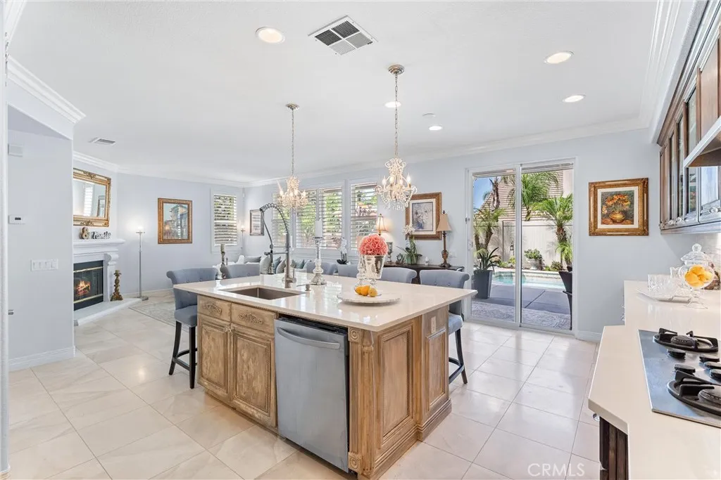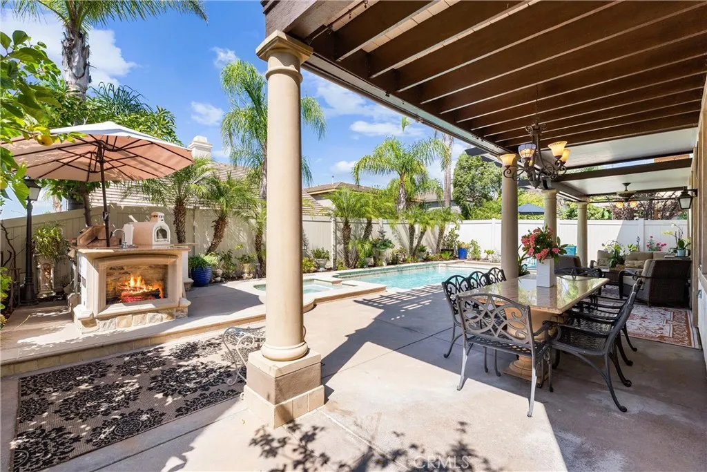 Huge price reduction! Price to sell! Timeless, romantic, and immaculate, this European influenced estate in Serrano Heights is a dream come true! Built in 2003 with 9' high ceilings. No expense was spared on creating this stunning Mediterranean-style home. Towering cypress trees, numerous palms, and blooming flowers will greet you happily upon your arrival. As you walk to the front door, the smooth stucco walls, the handsome stone frames around the doors and windows, and the keystones with a carved shell motif give you a sense of nostalgia. Inside, a charming foyer, a cozy living room, and a formal dining room welcome you! Open to the family room with an elegant fireplace, the kitchen is a chef's dream. It boasts a central island with antique finish cabinetry, glass paneled cabinet doors, stainless steel appliances, under-cabinet lights, 3 cm quartz countertops, & full stone/glass backsplash. Next to the kitchen, a good sized den can be turned into a bedroom easily. Fully upgraded, the bath downstairs features a classic vanity, travertine walls, & a travertine shower with a custom soap box. Upstairs, the primary suite showcases a covered balcony with travertine tile floor-perfect for you to unwind and enjoy the spectacular sunset views after work! The primary bath's highlights include granite countertops, a soaking tub, a granite walk-in shower, dual vanities, a makeup vanity, & a huge walk-in closet with a closet organizer. 2 secondary bedrooms with walk-in closets share a jack-and-jill bath which also has antique finish cabinets, 3 cm quartz countertop, & stone mosaic bac