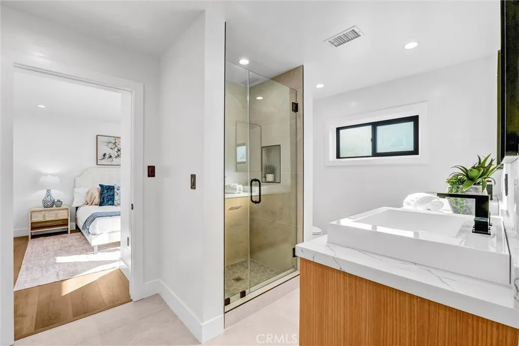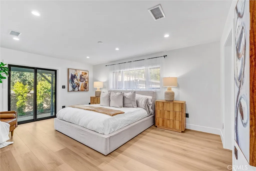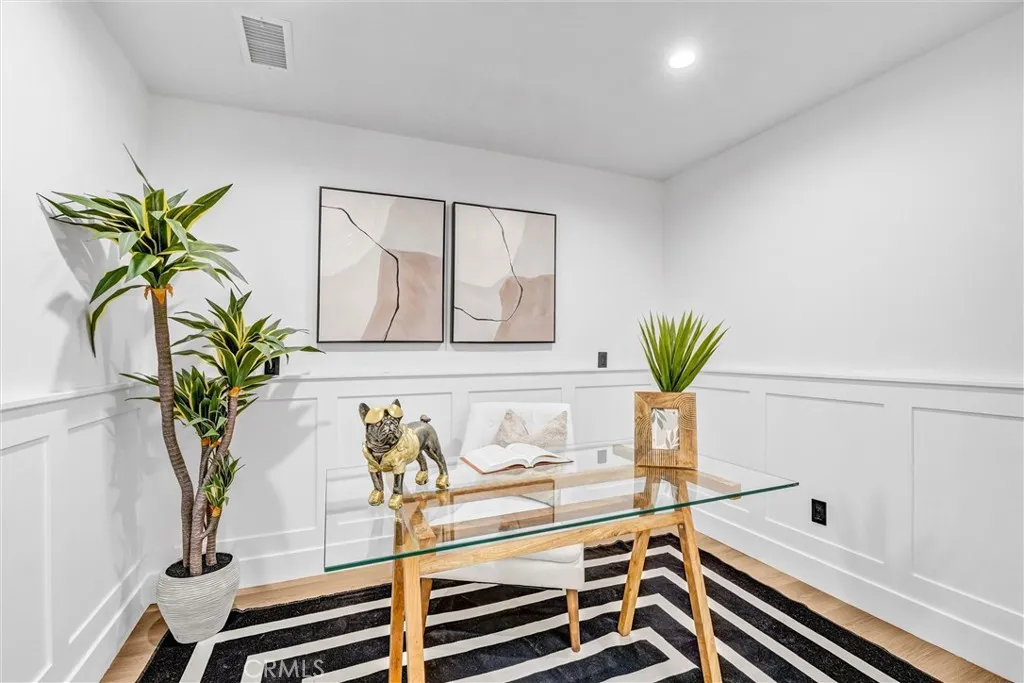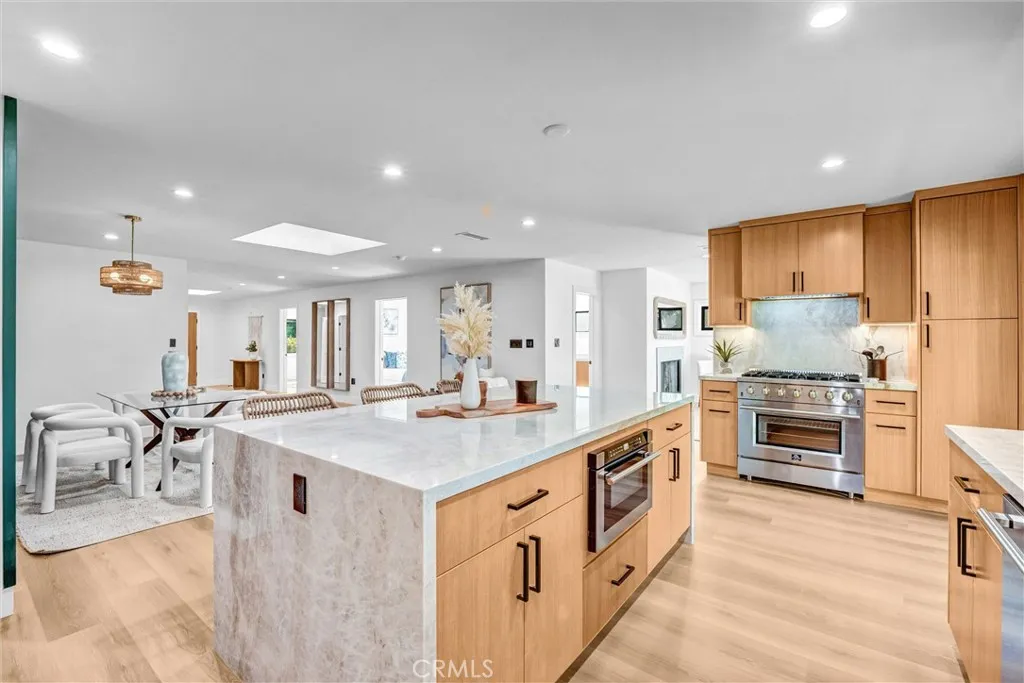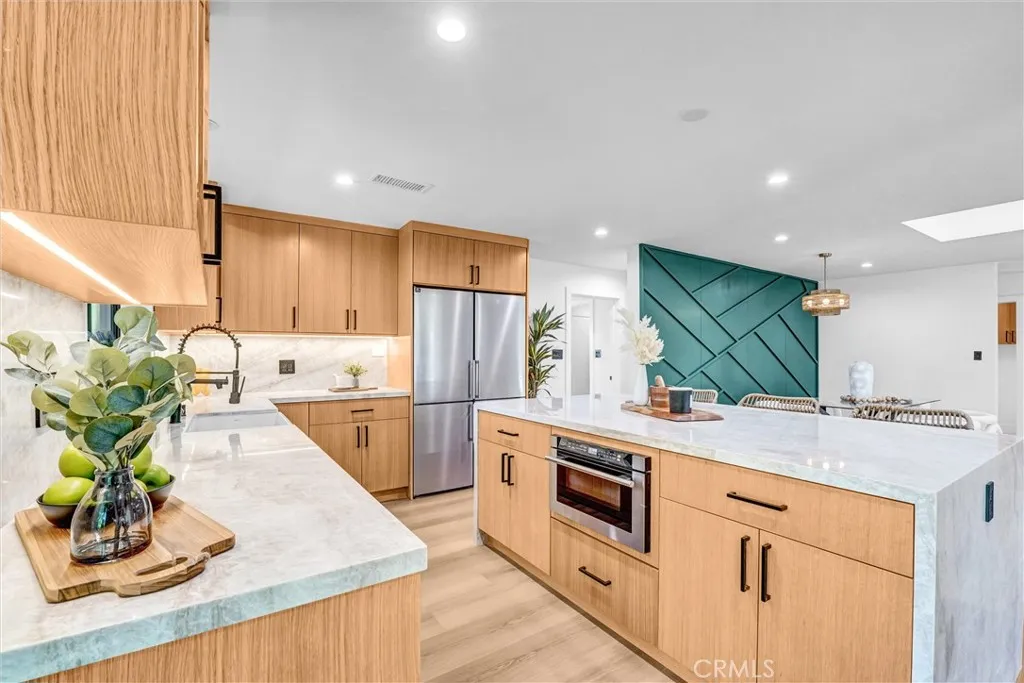 This beautifully reimagined 4-bedroom, plus office, 3-and-a-half-bathroom residence sits gracefully on a corner lot along one of the areas most picturesque, tree-lined streets. Every element of the home has been thoughtfully redesigned to blend sophistication, natural light, and seamless flow throughout. An inviting foyer opens to expansive, open-concept living areas where high ceilings, skylights, and refined finishes create an effortless sense of space. Just off the entry, a private enclosed office with glass double doors offers the ideal work-from-home retreat quiet, functional, and filled with light. At the heart of the home lies the designer kitchen, anchored by a large island and countertops crafted from Taj Mahal quartzite, White Oak custom cabinetry, and premium appliances. Thoughtfully designed for both gatherings and everyday living, it opens to the dining area and an inviting family room with a fireplace all connected by sliding doors that open to a covered patio framed by greenery and subtle landscape lighting creating a warm, intimate space ideal for dining al fresco or entertaining close friends. The primary suite serves as a tranquil escape with direct access to the backyard and a spa-inspired bath complete with a freestanding soaking tub. Each of the homes bedrooms is exceptionally spacious, offering comfort, versatility, and beautiful natural light ideal for family, guests, or creative use. Every detail reflects quality craftsmanship and timeless design a modern home set within one of the neighborhoods most desirable and inviting settings. The property