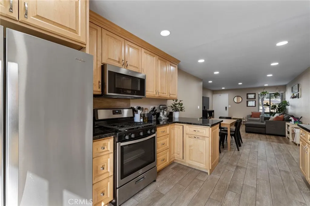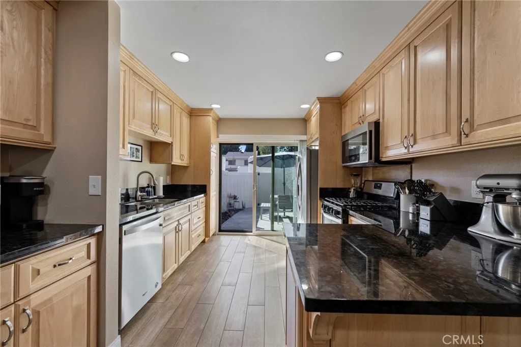 This spacious and meticulously updated 2-bedroom home offers tons of modern comfort and style, along with 1.5 beautifully updated bathrooms with contemporary fixtures and finishes. The home was recently remodeled to include a half bathroom off the master bedroom, creating a convenient master suite, in addition to the full bathroom. Both bathrooms are meticulously updated with Arizona tile flooring and shower and Kohler and Delta appliances. The stunning kitchen boasts plenty of features that were all installed in 2021, such as: updated solid wood cabinetry with elegant hardware, sleek granite countertops, and high-end appliances such as the stove, microwave and dishwasher. This is all complemented by recessed lighting and a large high quality glass slider door to the private patio backyard, allowing in a flood of natural afternoon light. The open-concept layout of this beautiful home features high-end wood laminate flooring throughout, installed in 2021. Both bedrooms are spacious, with floor-to-ceiling mirror slider doors for the ample closet space, and real pine baseboards. Newer dual pane windows throughout the home. The home has a high-end smart climate control system connected to the newer furnace and air conditioning unit, plus, there is an attic fan system for quick, efficient cooling when you get home on those hot summer days. Outside the glass slider door, the spacious and private patio backyard provides a serene retreat for relaxation or gatherings. This yard connects to the spacious 2-car garage which includes convenient laundry facilities, adding to the homes fu