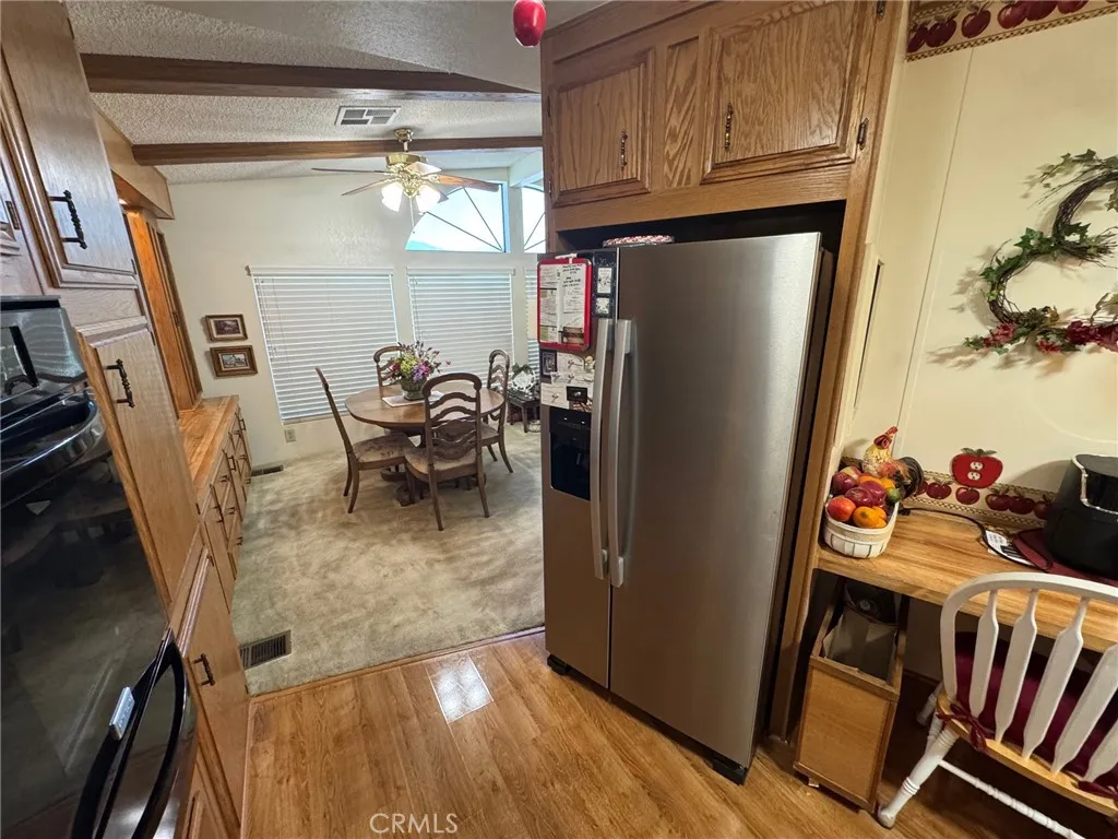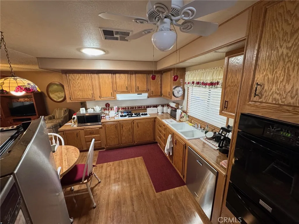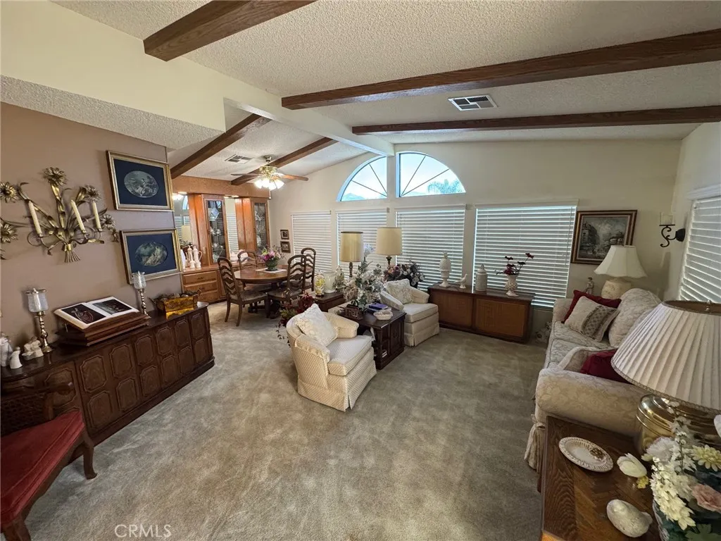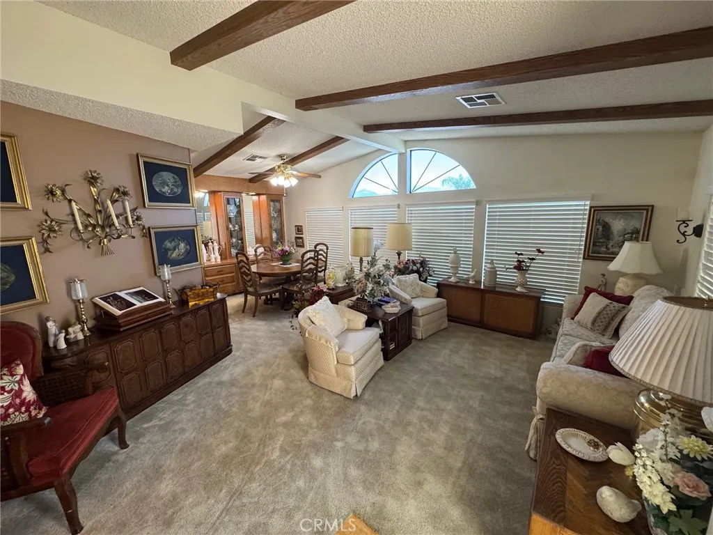 Beautiful 2-Bedroom Home (Space #58) in Mountain View Park (55+ Community East Hemet). This charming 1,440 sq. ft. home is located in one of East Hemets most desirable 55+ communities, Mountain View Park. Enjoy stunning open views from the living room with scenic mountain backdrops. The spacious kitchen includes a cozy breakfast area, cooktop and hood, KitchenAid dishwasher, double sink, pull-out storage, and attractive laminate flooring. The ceiling features decorative wood beams that add warmth and character. Additional highlights include solar shades on the east side, ceiling fans in every room, and a dedicated laundry room with a wash sink and convenient built-in desk area. Outside, the yard is fully fenced and beautifully landscaped with a plum tree and inviting patioperfect for relaxing or entertaining. This one is a true charmermove-in ready and full of warmth!