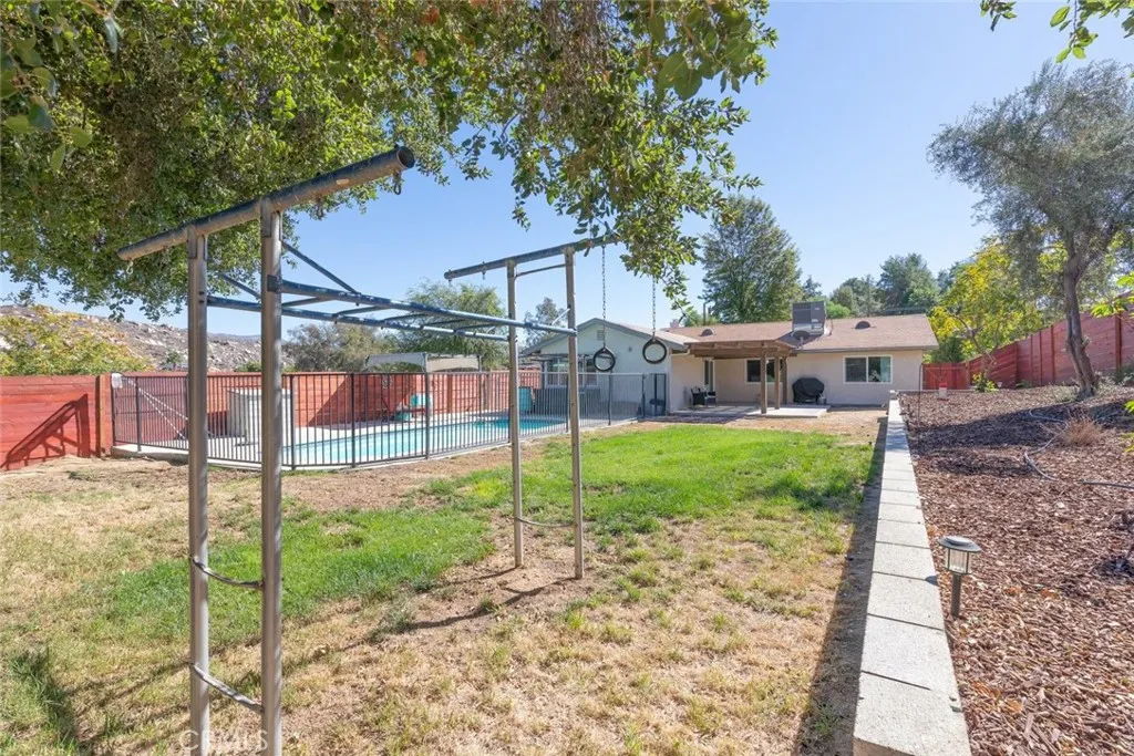 Welcome to your own private retreatthis charming ranch-style pool home sits on a spacious lot with sweeping views of the San Jacinto Valley and surrounding mountains. Freshly updated inside and out, the property features new dual-pane windows, new carpet, fresh interior and exterior paint, and a new electric front gate for added convenience and security. Step inside through a covered arched patio and into a warm, inviting living area complete with a wood-burning fireplace, perfect for cozy evenings. The kitchen opens seamlessly to a spacious family room where you can entertain guests or relax while overlooking the sparkling in-ground pool and scenic backyard. The kitchen comes equipped with stainless steel appliances, under-cabinet lighting, and ample counter space. The primary suite features French doors, a walk-in closet, and a private bath. Two additional bedrooms offer comfort and natural light. Outside, youll find an expansive backyard with mature shade and fruit trees, plenty of room for gatherings, gardening, or even a future small horse setup or additional structure. The newly added backyard patio enhances outdoor living, while the two-car garage delivers abundant storage and workspace. A detached front office provides versatile options for work, hobbies. Nestled at the end of a peaceful cul-de-sac, this home offers a sense of country living while still being just minutes from Diamond Valley Lake, Valley-Wide Park, and local amenities. Move-in ready and full of charmdont miss your chance to own this beautiful, upgraded ranch home! Home has been virtually staged to s