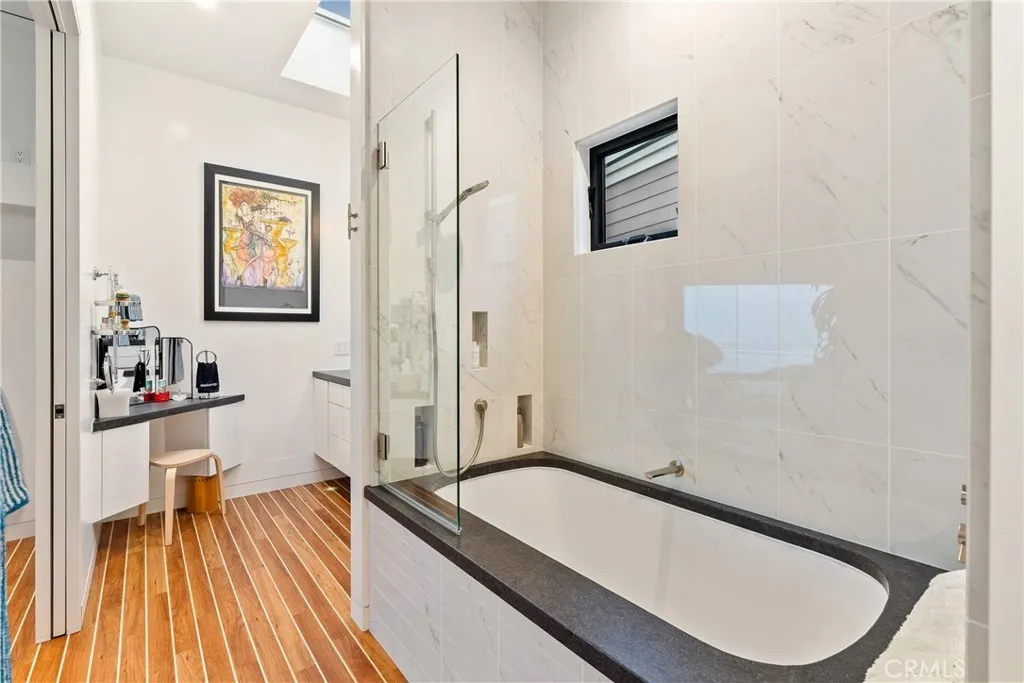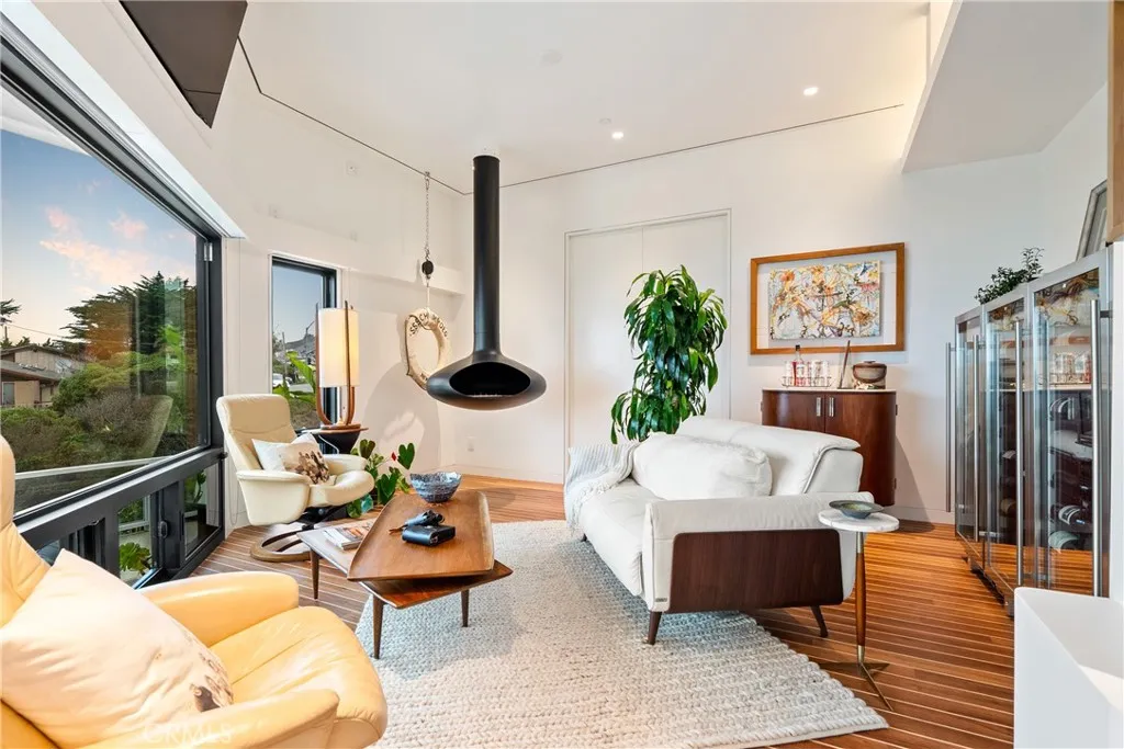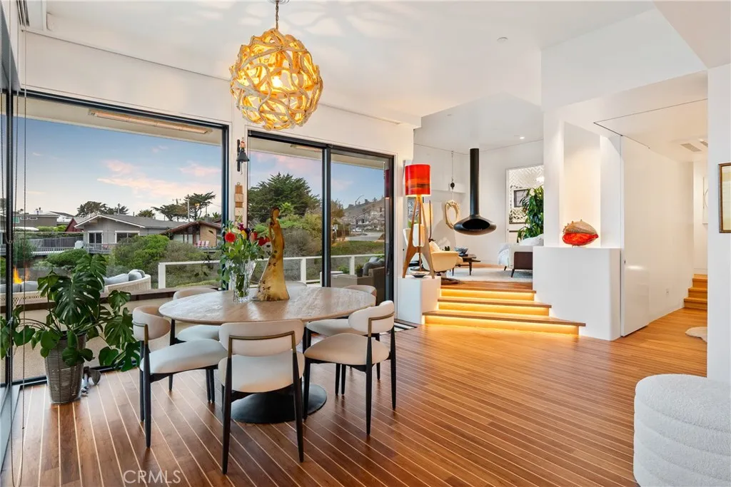 One-of-a-kind oceanfront home on Studio Drive, angled beside Cayucos Creek, with unobstructed panoramic ocean views in a private gated community. This three-bedroom, two-bath home offers modern coastal elegance, blending clean European lines with warm nautical influences. You are greeted by a front courtyard patio with an outdoor shower, storage for surfboards and wetsuits, and a comfortable seating area. A custom mahogany front door opens to a light-filled open floor plan and a stylish kitchen featuring high-gloss, push-to-open cabinetry and Caf matte white appliances with bronze accents. Durable marine-grade teak and holly yacht-style custom flooring runs throughout, adding a subtle nautical touch with easy maintenance. The home is centered around its ocean views. Wide doors from the primary bedroom and ensuite bath open fully to take in the ocean from the comfort of your bed or soaking tub. The spa-style bath features matte black counters, a deep soaking tub, minimalist fixtures, a vanity station, in-drawer powered hair appliance storage, and additional built-in drawers. Large ocean-facing windows in the contemporary living area, along with a unique eco-fuel suspended fireplace and layered accent lighting, create a relaxing coastal ambiance. The secondary bedroom and ensuite bath offer a private, thoughtful layout with access to multiple areas of the home. Additional features include a well-appointed laundry room that can double as a mudroom, and a separate storage room with custom cabinetry that includes a pocket office. The finished garage features epoxy flooring, two