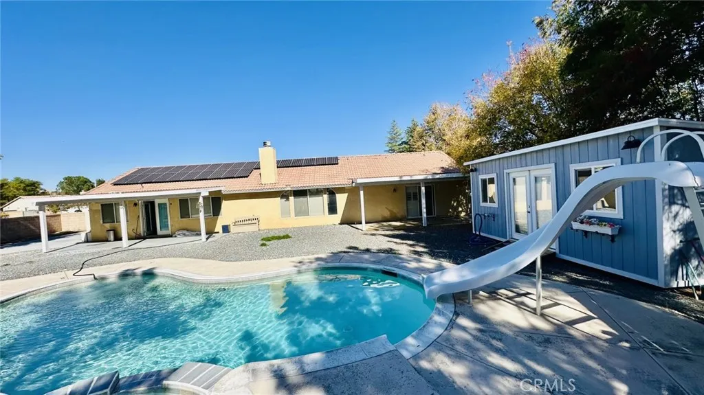 Welcome to your desert oasis! This stunning Apple Valley home combines modern luxury with panoramic high Desert views. Situated on a spacious lot in a quiet sought-after neighborhood. This property offers comfort, privacy, and elegant design throughout with a 27 panel solar system included. Open-concept floor including an office with abundant natural light and vaulted ceilings. Gourmet kitchen featuring granite countertops, custom cabinetry, and stainless-steel appliances.Spacious primary suite with walk-in closet, dual vanities, and a soaking tub.Formal dining area and inviting living room with fireplace perfect for entertaining. Three-car garage with an extra room and ample driveway parking.Beautifully landscaped front yard and expensive backyard ideal for gatherings with a pool that comes with a newer pump and filter system , jacuzzi and a private shower and bath. Breathtaking mountain and valley views from the patio and living areas with a feel of the color Rose Gold. Located just minutes from shopping, dining, and award-winning schools. This home offers the best of Apple Valley living, peace, space, convenience and luxury all in one including RV access and 80ft RV space.