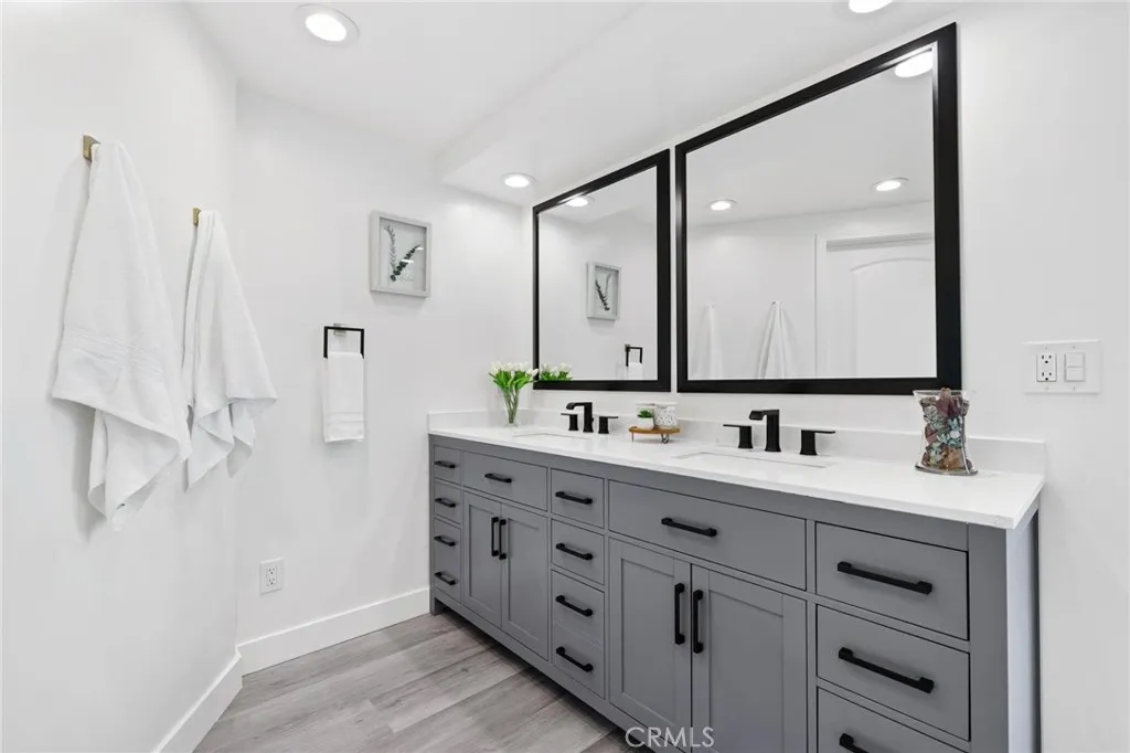 RARE FIND - Remodeled and Move-In Ready Northridge Two Story! This stunning residence offers the perfect blend of modern elegance and convenient living with 2 primary bedrooms one on the main level and one on upper perfect for multi-generational / extended family living. Boasting a comfortable and flexible 5 bedroom layout with a convertible den that can effortlessly be transformed into a 5th bedroom, along with 4.5 stunning bathrooms, boasting both comfort and style. This home has undergone a comprehensive renovation, leaving no detail overlooked. From the striking kitchen and baths, designer luxury vinyl plank flooring to the upgraded fixtures throughout, every inch of the property exudes a fresh and modern aesthetic. The thoughtfully designed floor plan is bathed in natural light, creating an inviting atmosphere throughout. An elegant living room is the perfect place to unwind by the cozy fireplace, creating a warm and inviting ambiance for gatherings with family and friends and offers a sliding glass door with views to the rear yard. The heart of the home, the kitchen is a chef's dream come true, featuring stunning quartz countertops, an abundance of cabinet space, quality stainless steel appliances and a breakfast area, the kitchen is as functional as it is stylish. Continue on into the step-down dining area and family room that providing ample space for relaxation and entertainment with wet bar, bath for guest and another sliding glass door that creates that great indoor / outdoor feel. Upstairs you will find the expansive main primary suite with a walk-in closet,