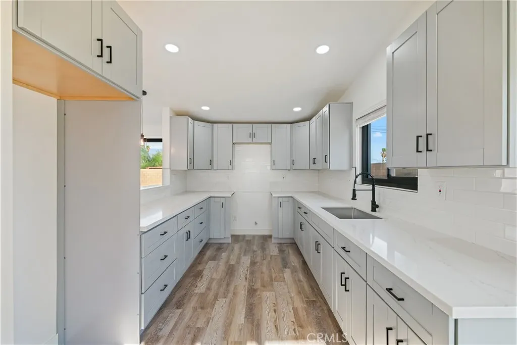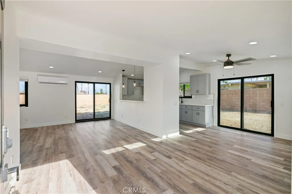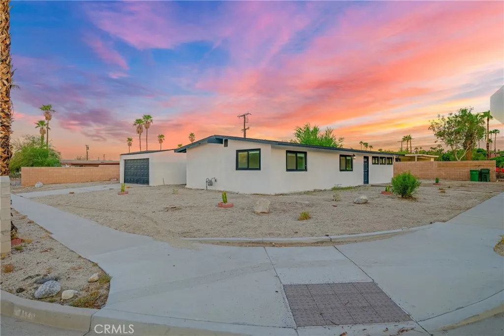Welcome to Gateway EstatesNO HOA, a rarity in nearby communitieswhere this corner-lot renovation takes in the San Jacinto backdrop and leans into easy desert living. Inside, black-frame dual-pane vinyl windows and recessed LED lighting keep the spaces bright and calm. The kitchen layers shaker cabinetry, quartz slab counters, and subway tile, with a long serving bar that opens to the living area for effortless gatherings. Two refreshed baths showcase large-format tile and clean, modern fixtures; durable LVP ties the rooms together with a cohesive look. Comfort is handled by a whisper-quiet ductless mini-split that heats and cools efficiently, and an upgraded electrical panel adds everyday confidence. Outside, the oversized, mostly walled yard is ready for your visionpool, spa, fire pit, or water-wise landscape (buyer to verify). The detached garage includes washer/dryer hookups; it is a garage (not an ADU), though ADU potential may be explored with the City. North-end location close to Uptown/Downtown Palm Springs, the Aerial Tramway, dining, and shops. The City regulates short-term rentals by neighborhood; buyers should confirm current eligibility and requirements for this address. Buyer to verify all permits, square footage, lot size, and ADU feasibility.