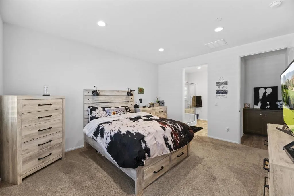 Nestled in the desirable Brisas community, this home offers an inviting open-concept living area enhanced by tall, vaulted ceilings and abundant natural light. The modern kitchen features a spacious island, granite counters, walk-in pantry, and plantation shutters throughout the main living spaces add a refined touch. Glass sliders off the dining area lead to the backyard, a true blank canvas ready for your personal vision. The private primary suite includes dual sinks, a large walk-in shower, and a generous walk-in closet. A dedicated laundry room with extra storage adds everyday convenience. The property feels quiet and private with neighbors only on one side, plus low-maintenance front landscaping and an owned solar system for energy efficiency. Additional highlights include a two-car garage with epoxy flooring and overhead storage, low HOA fees, and access to the community park and sport courts. All just minutes from shopping, dining, wineries, and more.