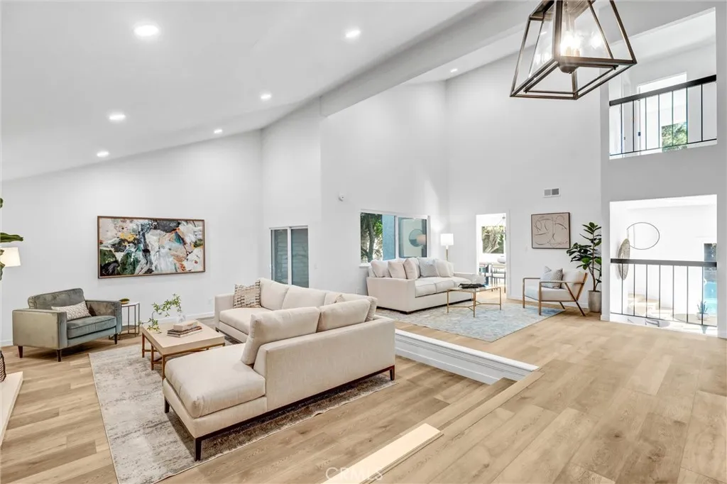 Welcome to a warm and inviting haven in Saratoga Hills. This beautifully updated, turn-key Calabasas pool home blends modern comfort with timeless style in one of the areas most sought-after neighborhoods. Offering 5 bedrooms, 3 bathrooms, and 2,961 sq. ft. of living space on an 8,970 sq. ft. lot, it provides an ideal setting for both everyday living and effortless entertaining. The home welcomes you with soaring vaulted ceilings, brand-new dual-pane windows, and luxury vinyl plank flooring throughout the main level. A statement hand-finished fireplace anchors the bright living area, which flows seamlessly into the dining spaces. The beautifully updated kitchen features waterfall-edge quartz countertops, stainless steel appliances, a central island, and sliding doors opening to the tranquil backyard and pool. The main level also includes a spacious guest bedroom and a full bathroom with direct backyard and pool access perfect for visitors, multigenerational living, or a home office. Direct access to the three-car garage adds everyday convenience. Upstairs, the primary suite is a serene retreat with high ceilings, a private deck, and his-and-hers walk-in closets. The spa-inspired ensuite bath offers a walk-in shower and dual vanities. Three additional upstairs bedrooms are filled with natural light and overlook the peaceful backyard and pool area. The private backyard is a true oasis, showcasing an inground heated pool, multiple seating areas, and mature landscaping ideal for outdoor dining, relaxing, or hosting gatherings. Located near Grape Arbor Park and within close prox