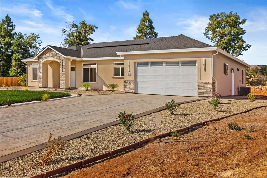 Welcome to the home in the location you've been waiting for! Tucked back on a quiet cul-de-sac of conforming homes with OWNED SOLAR, this home is sure to impress. Through the double front doors, you are greeted into the foyer which includes a coat closet to the left, and formal dining area to the right, then leads you into the open and airy living area. The living area features a vaulted ceiling, modern ceiling fan, a cozy electric fireplace with floor to ceiling stone detail, and a large slider leading to the low-maintenance backyard. The gourmet kitchen features quartz countertops with a waterfall island, LG stainless steel appliances, a gas cooktop, walk-in pantry, and farmhouse sink. This sought after split floor plan, provides a private primary suite that contains a walk-in closet, and attached bathroom that includes a dual sink vanity, soaking tub, and step-in shower. On the same end of the home is a half bathroom, and large laundry room with tons of cabinet and counter space. At the other end of the home are the 2 guest bedrooms, and guest bathroom. Additional features include a whole house fan, 2 car garage, exterior stamped concrete and so much more!