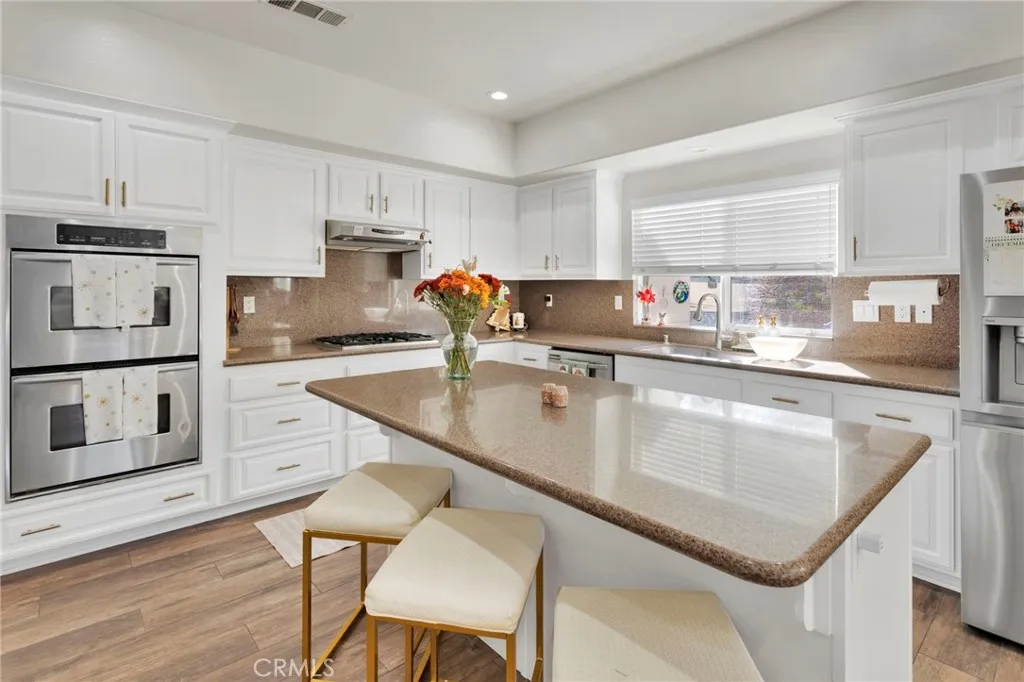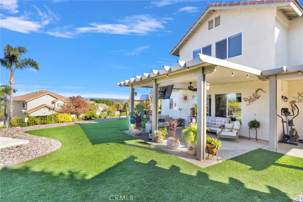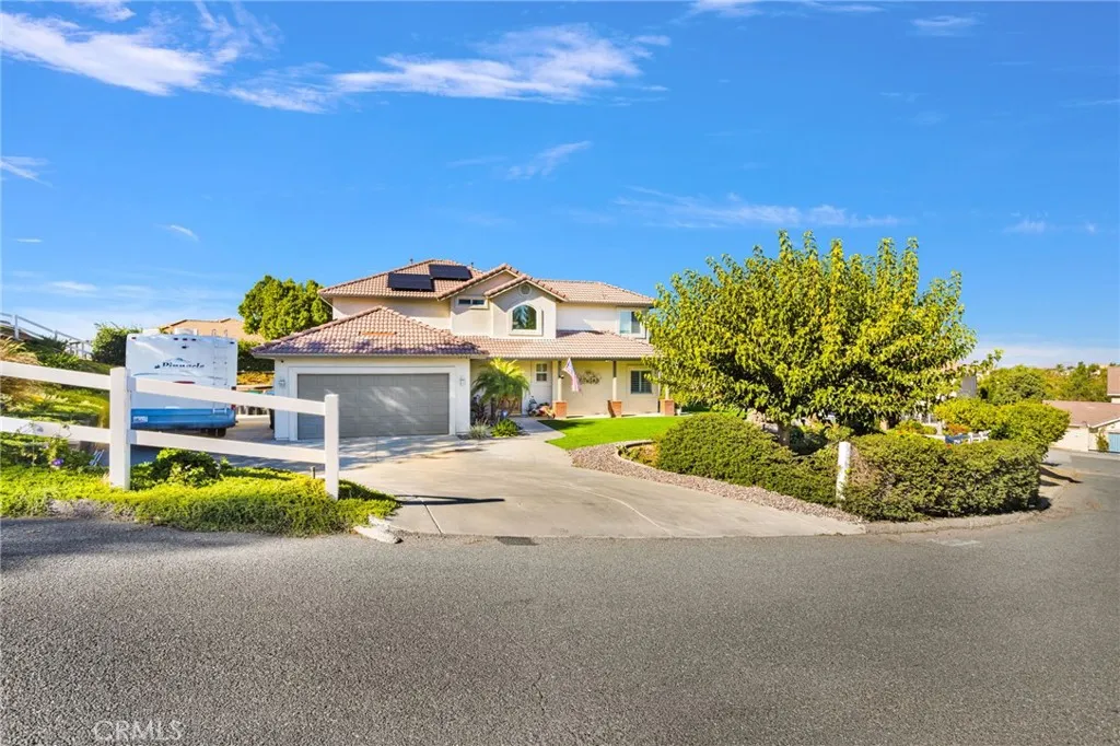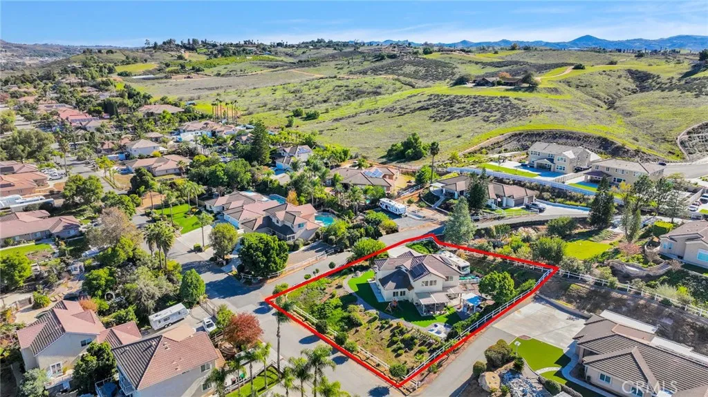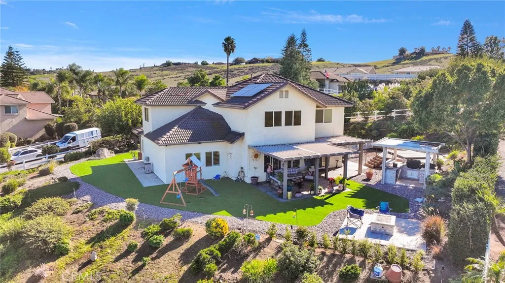 Where Panoramic Beauty Meets Everyday Living! This entertainers dream is situated on over a half-acre in one of Canyon Ridge Estates most secluded and sought-after cul-de-sac locations. Enjoy breathtaking rolling-hill and city-light views from this serene South Riverside retreatcomplete with PAID SOLAR for exceptional energy savings and efficiency. The backyard has been newly transformed with top-of-the-line artificial turf, an above-ground spa with a custom deck, and a beautiful outdoor living area featuring a stone-built fireplace. The impressive stone outdoor kitchen includes a built-in BBQ, refrigerator, sink, ample storage, and a covered patioperfect for year-round gatherings. Lush landscaping and mature fruit trees (multiple varieties of orange, apple, lemon, key lime, guava, grapefruit, and mandarin) line the property, creating a peaceful setting that feels worlds away yet close to everything. Inside, natural light fills the inviting foyer and flows into the living room with a beautifully updated fireplace faade. The open floorplan continues into the spacious dining area and kitchen, which features a grand island, stainless steel appliances including a double oven, full granite backsplash, and well-appointed cabinetry. A custom walk-in pantry and dedicated laundry room with sink and storage enhance function and convenience. The lower level also offers a generous powder room and a downstairs primary suite with double-door entry, abundant sunlight, walk-in closet, and a large ensuite bathroom with dual sinks, granite counters, separate shower, and soaking tub. Upstairs