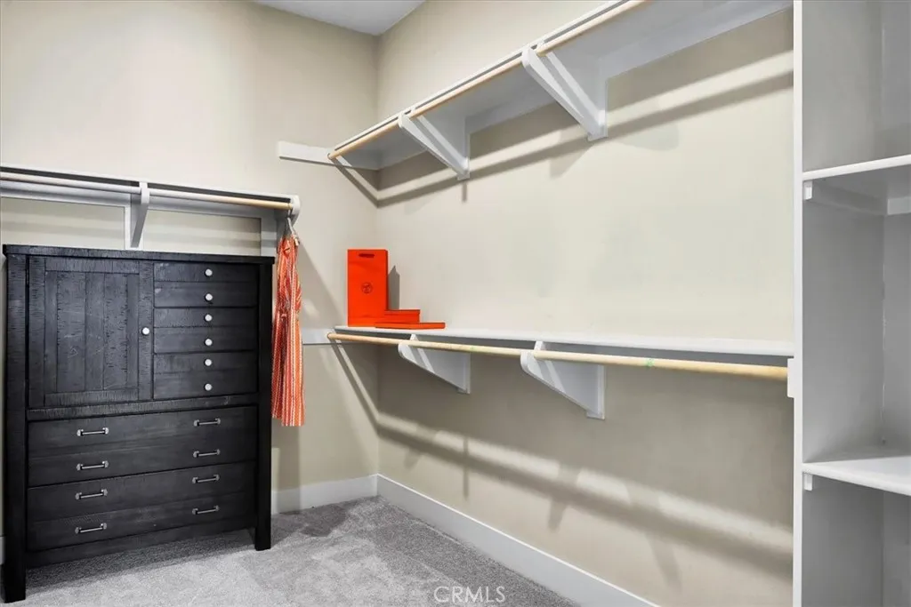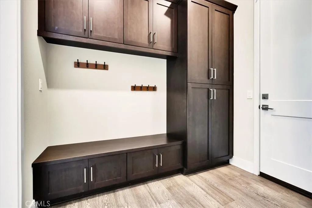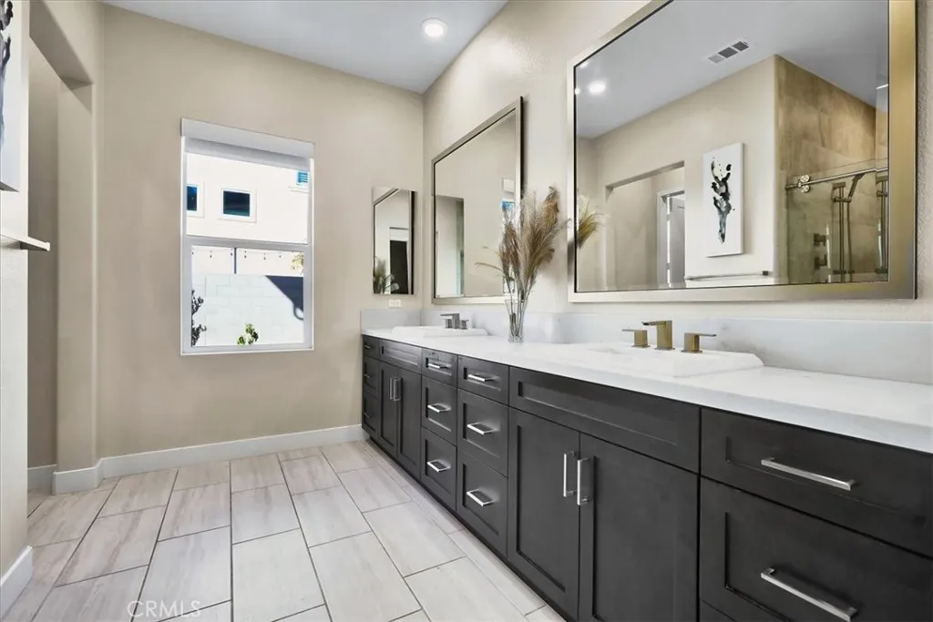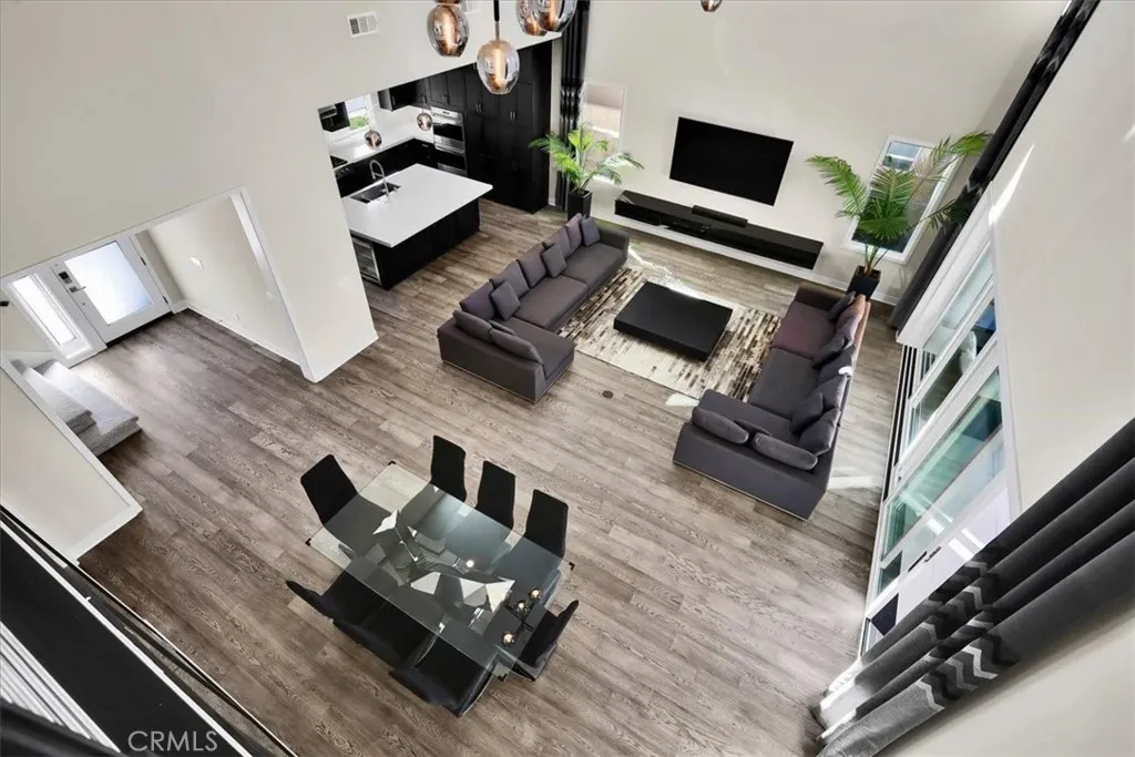 Nestled within the prestigious 24/7 guard-gated community of Altair Irvine, this cul-de-sac home combines modern design and elevated finishes throughout. The neighborhood also benefits from 24-hour security patrol throughout the community offering an added level of comfort. Beautiful curb appeal, neat landscaping, and a two-car driveway set the tone before entering through an impressive front door into a bright, open-concept interior. The main level features a breathtaking great room with high ceilings, recessed lighting, elegant fixtures, and clerestory windows that draw in abundant natural light. Hardwood floors extend through the living and dining areas, all connected seamlessly to the expansive chefs kitchen. The kitchen offers dark wood cabinetry, stainless-steel appliances, extensive storage, and a massive island with bar seating. Large sliding glass doors open to a beautifully appointed California room complete with recessed lighting and a fireplace. The backyard continues with clean hardscape and a manicured grassy lawn. The main-floor primary suite is conveniently tucked off the great room featuring tall ceilings, generous windows, and a spacious walk-in closet. The ensuite bath includes a dual-sink vanity, separate water closet, linen storage, and a large glass-enclosed shower with stone tilework, a rainfall showerhead, handheld shower wand, and built-in bench. Also on the first floor is a transition space with cabinetry that leads to a powder room, utility closet, and direct access to the two-car garage, which features additional storage. A staircase near the ent