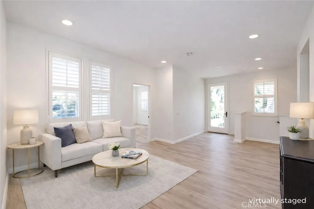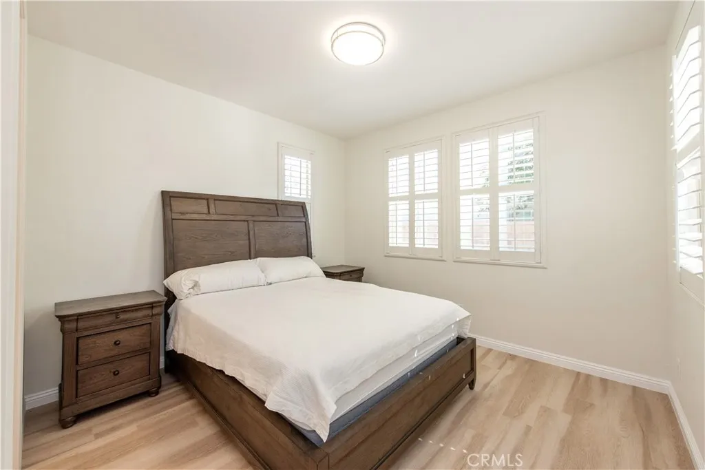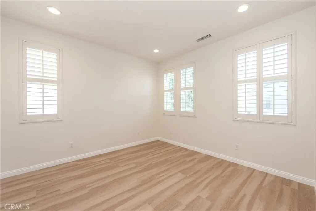 Located in the highly sought-after Portola Springs village of Irvine, this elegant 4-bedroom, 3.5-bath residence is situated on a premium corner lot, offering enhanced privacy, abundant natural light, and strong curb appeal. The home features a rare full driveway and an attached two-car garage. The thoughtfully designed layout includes a welcoming street-facing entrance and a side-entry garage opening to a motor court, providing both functionality and privacy. A first-floor bedroom suite with a private bath offers flexible use for guests or a home office. This space is filled with natural light from windows on three sides and includes a spacious shower. A nearby powder room and coat closet add everyday practicality, while upgraded flooring throughout the main living areas delivers a clean, cohesive finish. The main living space is arranged in an open-concept great room, seamlessly connecting the living room, dining area, and kitchen. Large windows and sliding glass doors bring in abundant natural light and open to the patio, creating an easy indoor-outdoor flow. The kitchen features a central island with seating, generous counter space, extensive cabinetry, and direct access to the garage. The patio offers a comfortable setting for outdoor dining and entertaining. Upstairs, a versatile bonus room provides flexible space for a media lounge, home office, or play area. The second level also includes three additional bedrooms, a full bathroom with dual sinks, and a dedicated laundry room with side-by-side washer and dryer space and an optional sink. The primary suite occupies i
