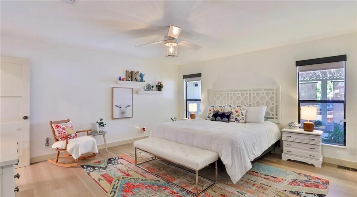 GORGEOUS CORNER LOT + 2 CAR GARAGE home in the 55+ community of Golf Knolls. A rare and incredible find! Permanent Foundation and parking for 6 cars. You will love the almost maintenance-free over-sized lot! Enjoy the rosy sunset views, and lounge around on your two covered patios, outdoor eating area, and private Zen garden! The exterior of the home has been transformed with faux grass in the front yard, fresh landscaping, retaining wall added and several security motion lights. Now, let's talk about the inside of your new home! Luxury vinyl plank flooring, new baseboards, wood paneled doors, vaulted ceilings, showcase owners attention to detail. Enormous living room, with motorized premium rolling fabric blinds with valances installed. You don't even have to get off the couch to close them! Modern sliding barn door opens up to the very versatile office/3rd bedroom. Indoor laundry room with tons of cabinet storage. Spacious and elegant kitchen features floating shelves, wood countertops, double ovens and stainless appliances. Custom lighting includes sconces, vanity, pendant and ceiling lighting. Guest bathroom has upgraded vanity and shower has been reglazed. Newer electrical outlets and switches, many with USB port connections. This is truly a must-see for you and your clients to appreciate. This neighborhood is known for its low taxes and HOA fees. The community pools and clubhouses elevate the relaxed lifestyle here, and special events are always on the calendar.