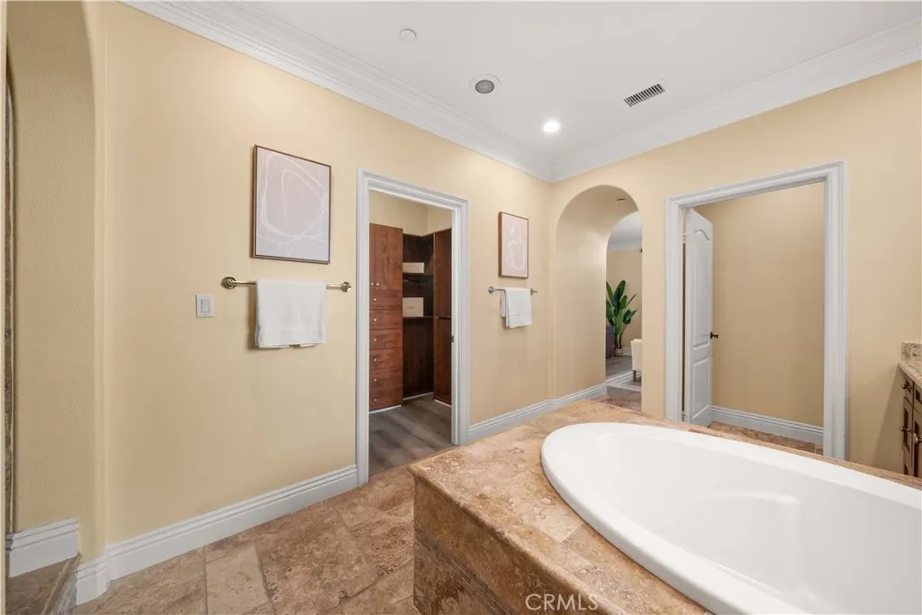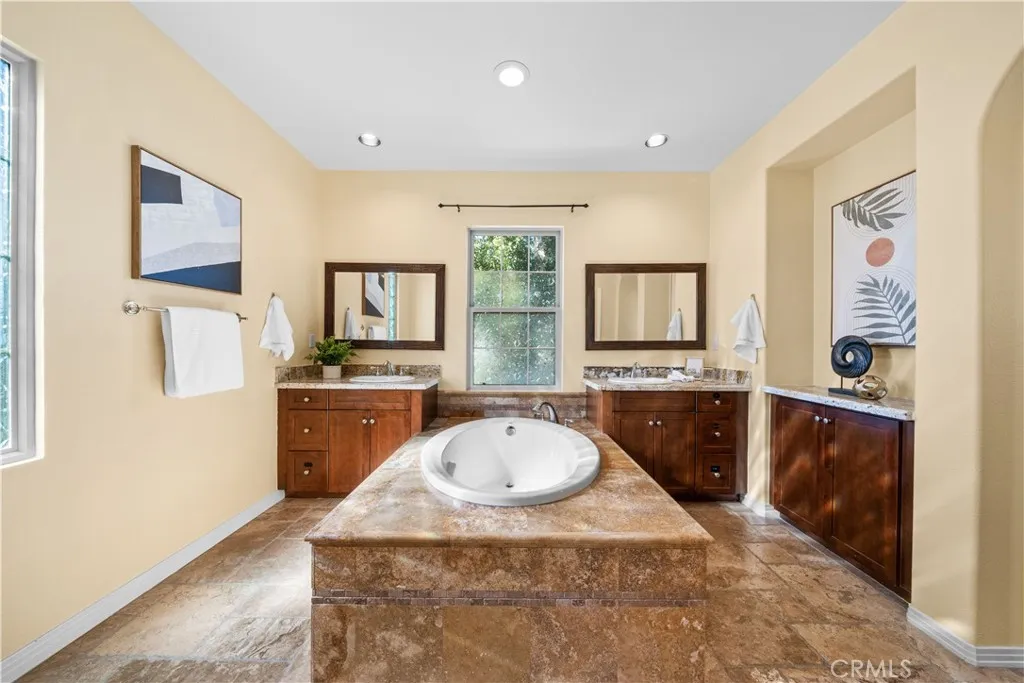 Rarely available Woodbury Treo Plan 2X featuring a master suite on each level and an exceptional 3-bedroom ensuite configuration where every room boasts its own private bathroom. This open and spacious layout feels like a single-family residence and is situated on one of the community's largest elevated corner lots at the end of a quiet cul-de-sac. Meticulously upgraded throughout, the home showcases beautiful stone floors on the main level and high-quality wood flooring throughout the entire second leveloffering a modern, carpet-free environment. The gourmet kitchen features premium stainless steel appliances and extensive stonework, overlooking a living area anchored by a grand fireplace. Custom built-ins in the closets and garage, luxurious multi-layered crown molding, designer paint, and upgraded chandeliers highlight the interior's sophistication. The oversized, professionally landscaped yard is a true sanctuary with flagstone flooring, water features, seat walls, and a wide variety of established fruit trees. Enjoy resort-style living with walking access to 14 parks, 7 pools, tennis courts, and the Jeffrey Open Space Trails, while being minutes from world-class shopping and top-rated Woodbury Elementary and Jeffrey Trail Middle School.