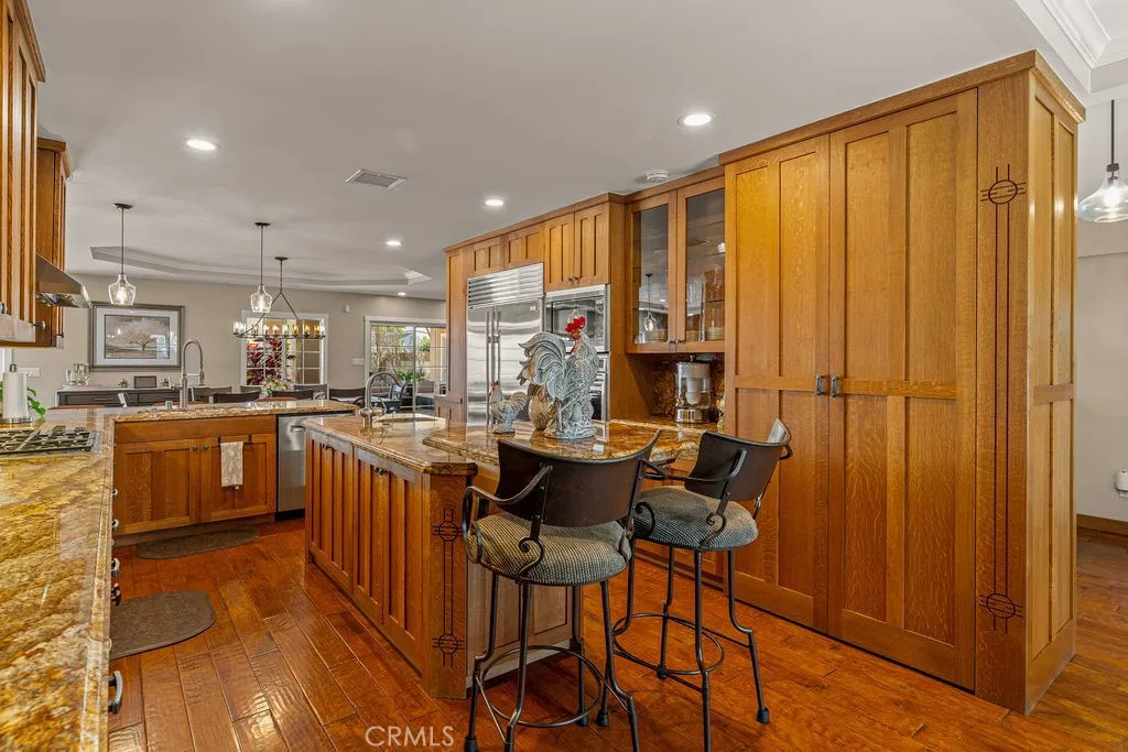 Tucked away on a private cul-de-sac north of Whittier Boulevard in the highly sought-after Michigan Park neighborhood of Whittier, this extraordinary single-level estate was masterfully designed for both grand entertaining and intimate everyday living. Offering nearly 2,400 square feet of refined living space on an expansive 12,700-square-foot lot, this residence delivers privacy, scale, and timeless sophistication. In addition to the main home, a beautifully appointed 594-square-foot permitted Casita creates a rare and flexible opportunity ideal as private guest quarters, an executive home office, multi-generational suite, or elegant pool house retreat. At the heart of the home lies a true chefs kitchen where no expense was spared. Outfitted with premium stainless steel appliances including a Wolf range, Sub-Zero refrigerator, and Bosch dishwasher, the space is elevated by custom Tiger Oak cabinetry and multiple granite preparation surfaces designed to inspire culinary creativity. The kitchen flows seamlessly into the expansive family room and dining area, creating an open-concept environment perfectly suited for sophisticated entertaining. Three fireplaces in the living room, the outdoor entertaining area, and the casita add warmth and ambiance throughout the property. Walls of windows and sliding glass doors bathe the interiors in natural light while framing picturesque views of the resort-caliber backyard. Step outside to your private oasis: a sparkling pool and spa, an inviting covered California Room, outdoor fireplace, and lush grassy area ideal for relaxation or
