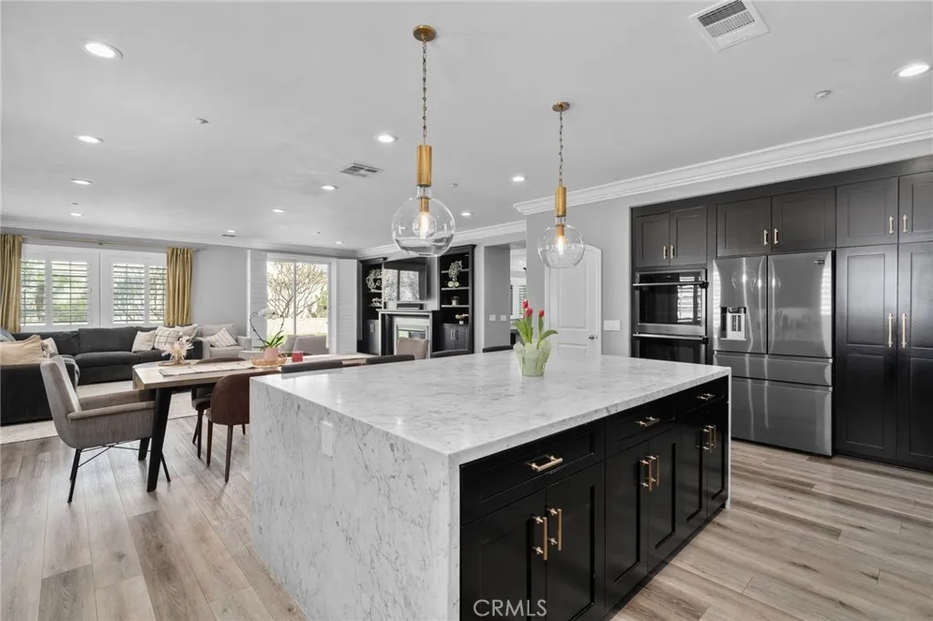 Absolutely stunning 5-bedroom, 4-bathroom home located in the highly desirable Montelago neighborhood - a rare opportunity, as homes here rarely come available. This residence showcases extensive high-end upgrades throughout, featuring elegant flooring, custom wall detailing, recessed lighting, and beautifully redesigned bathrooms. The heart of the home is a chef-inspired gourmet kitchen with sophisticated black custom cabinetry, dramatic marble countertops, oversized waterfall island, designer pendant lighting, and premium high-end appliances. The open-concept layout flows beautifully into multiple living and entertaining spaces, including a formal dining area, spacious family room, separate living room, and a custom built-in bar area perfect for large family gatherings and entertaining guests. Step outside to a spacious landscaped backyard offering endless possibilities for entertaining, relaxation, or recreation. The property also features massive RV parking with exceptional space for trucks, toys, trailers, RVs, and even oversized vehicles. A custom side-yard shed plus a baseball cage adds even more unique functionality to this exceptional property. This home truly combines luxury, functionality, and rare oversized amenities in one exceptional offering.