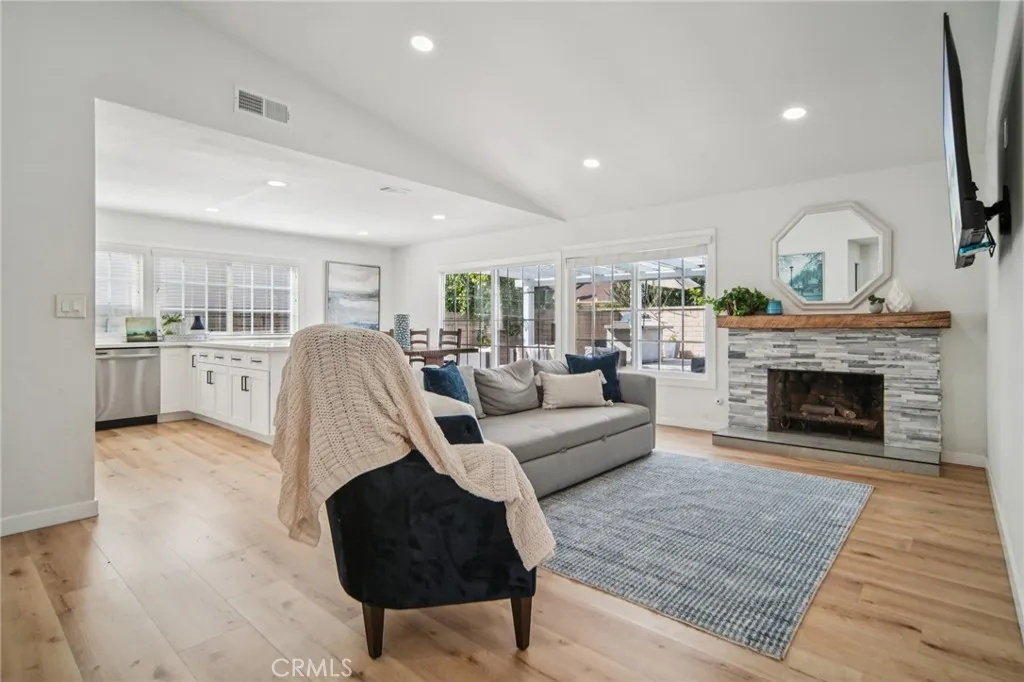 Cul-de-sac Pool Home Just Minutes from the Beach! Welcome to this beautifully renovated 4-bedroom pool home ideally located on a quiet cul-de-sac in a desirable Huntington Beach neighborhood, just a short walk to Hope View Elementary and only minutes from the sand and surf. This light-filled home offers an open and inviting floor plan with vaulted ceilings, a stylish stacked-stone fireplace, and luxury vinyl flooring throughoutperfect for easy coastal living. The spacious kitchen is designed for both everyday living and entertaining, featuring white shaker cabinetry, quartz countertops, stainless steel appliances, recessed LED lighting, and a large center island for gathering. All four bedrooms are generously sized with mirrored wardrobes, while both bathrooms have been tastefully upgraded with modern tile surrounds and updated fixtures. Step outside to your private backyard retreat featuring a saltwater pool, built-in BBQ area, and plenty of space for entertaining, relaxing, or enjoying sunny Southern California afternoons. Additional features include newer central air conditioning, dual-pane windows, updated plumbing and electrical, and an oversized two-car garage with a professionally finished epoxy floor. Ideally located near parks, shopping, dining, top-rated schools, and Huntington Beachs world-famous coastline, this move-in ready home offers the perfect blend of comfort, style, and coastal lifestyle.