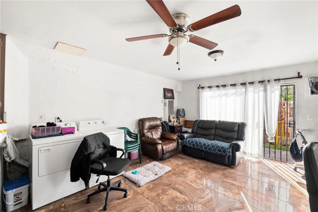 First-floor entry Private fenced patio Community pool Located in Santa Ana, this two-story condominium with first-floor entry offers a functional layout with private outdoor space and access to community amenities. The main living area features tile flooring, ceiling fan, and a sliding glass door that opens to a private fenced patio, creating an outdoor area for seating or additional storage. The kitchen includes cabinet storage, countertop workspace, and a gas range, with the living and dining areas connected in an open layout for everyday living. The first level also includes in-unit washer and dryer hookups and direct access to the patio. Upstairs, the home features two bedrooms and one bathroom, with ceiling fans, mirrored closet doors, and windows providing natural light. The bathroom includes a dual-sink vanity and tub/shower combination. Community amenities include a pool, playground, landscaped courtyard greenbelt areas, and maintained common grounds. HOA dues include insurance and sewer services. Located near Downtown Santa Ana, shopping centers, restaurants, and parks, with convenient access to Interstate 5, State Route 55, and State Route 22, providing connectivity throughout Orange County. This two-story condominium offers private outdoor space, community amenities, and access to nearby retail, dining, and transportation routes in Santa Ana.