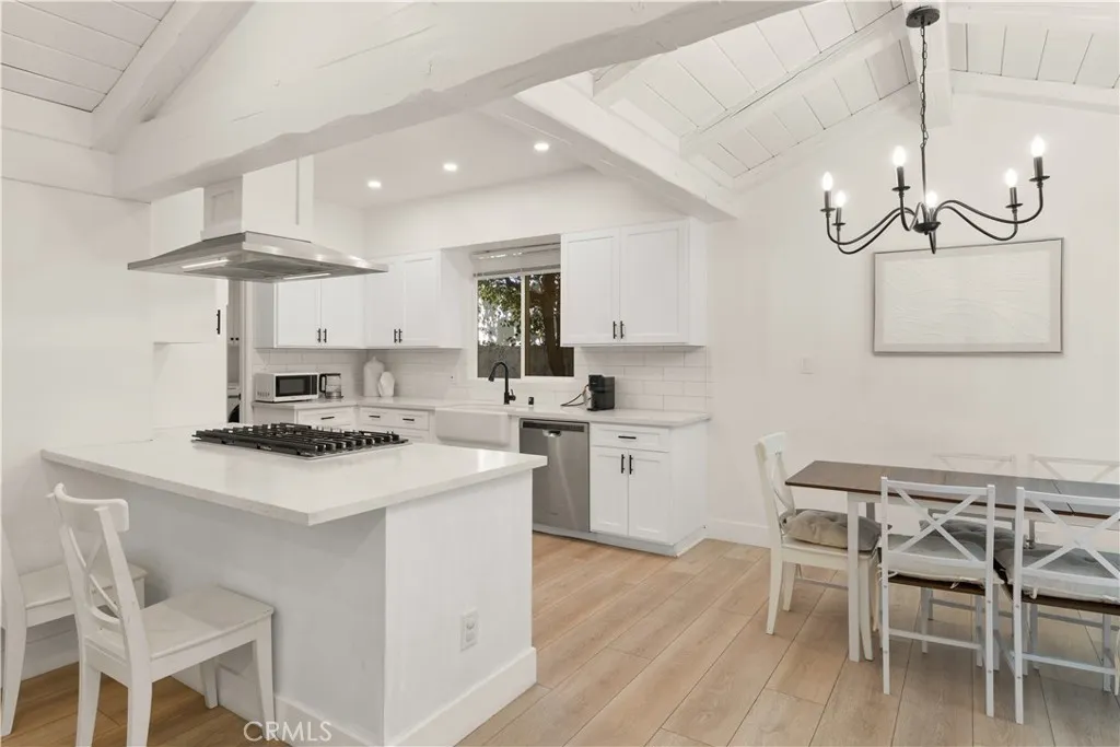 Welcome to this beautifully updated 4-bedroom, 2-bathroom home offering bright, open living in the heart of the San Fernando Valley. With fresh landscaping, a crisp white exterior with brick accents, and a newly installed modern gate for added privacy, the home offers great curb appeal from the moment you arrive. Step inside to an inviting open layout with beamed ceilings, recessed lighting, new vinyl flooring throughout, and abundant natural light. The spacious living room is anchored by a striking white brick fireplace and flows seamlessly into the kitchen, creating an ideal space for everyday living. The kitchen features white cabinetry, stainless steel appliances, a deep farmhouse sink, and bar seating. Adjacent to the kitchen is a convenient laundry room with a washer and dryer, pantry storage, and direct access to the backyard. One of the secondary bedrooms sits just off the living area behind elegant French doors, offering dual closets and views of the front yard. Two additional bedrooms are located down the hallway alongside a guest bathroom with dual vanities, quartz countertops, and ample cabinetry for storage. The bright primary suite provides a relaxing retreat, featuring vaulted ceilings, a walk-in closet, and an en-suite bathroom with dual sinks and a frameless glass walk-in shower. The spacious layout provides flexibility for family living, guests, or a home office. Outside, the expansive backyard offers plenty of space to relax, entertain, or create your own outdoor retreat. Additional highlights include solar and an attached two-car garage, all conveniently