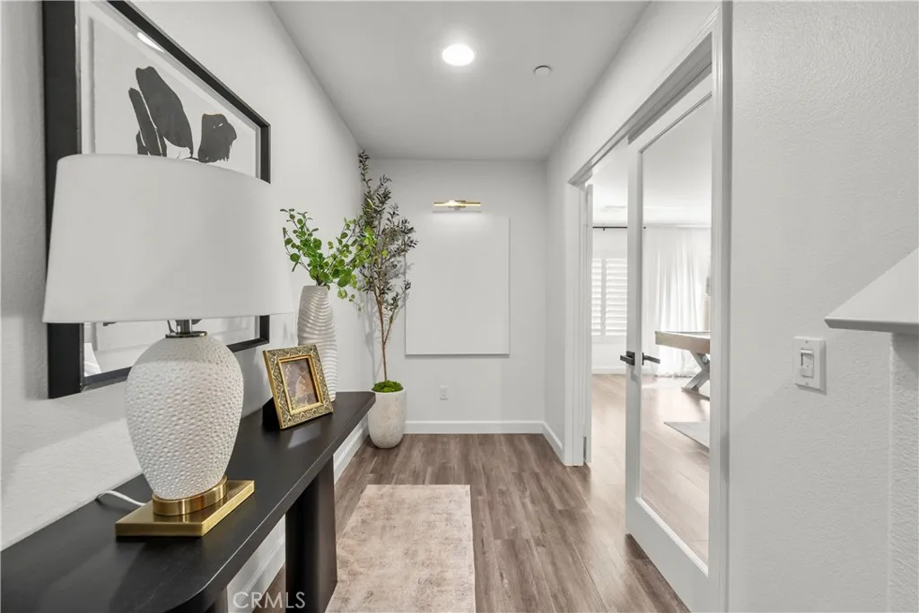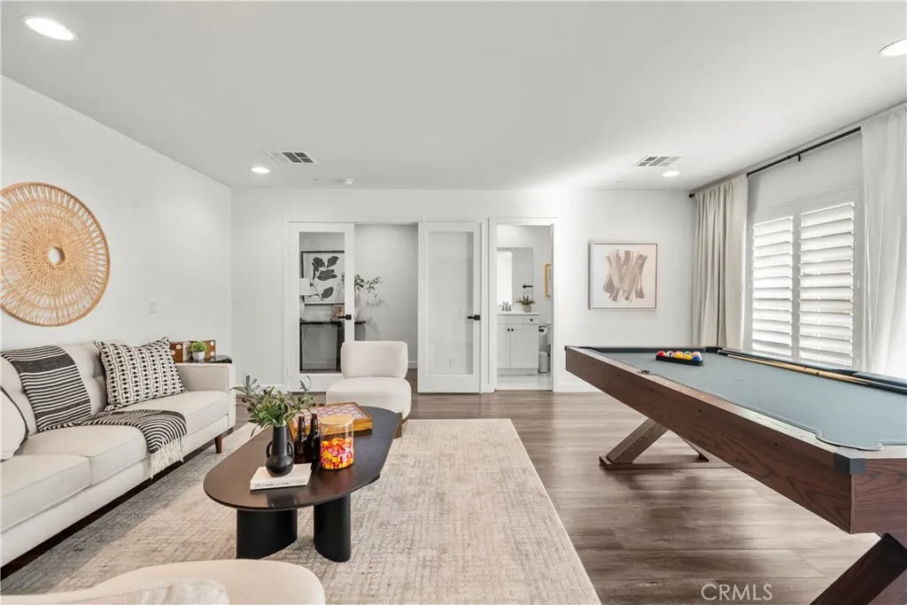 Located in the gated community of River Village, this spacious 4-bedroom, 4-bathroom tri-level townhouse offers flexible living, mountain views, and thoughtful upgrades throughout. The entry level welcomes you with a formal foyer that opens to a generous living roomperfect for relaxing or entertainingalong with a full bathroom and a private patio featuring a small turf yard, ideal for outdoor lounging, pets, or a bit of greenery without the maintenance. Laminate flooring and recessed lighting create a clean, modern feel. The second floor features a bright open-concept layout with 9-foot ceilings. The kitchen includes granite countertops, white shaker cabinetry, stainless steel appliances, and ample prep space, flowing easily into the main living and dining areas. This level also offers a bedroom and full bathroom, plus a long balcony with mountain viewsperfect for morning coffee or evening sunsets. Upstairs, the third floor hosts three additional bedrooms and two bathrooms, including the spacious primary suite with custom closet organization. A temperature-controlled wine cellar adds a unique and unexpected feature thats perfect for wine lovers and entertaining. Additional highlights include direct access to a two-car garage with built-in cabinets for extra storage. Residents enjoy River Village amenities including a gated pool and spa, barbecue and picnic areas, and a playground, creating an easy, community-oriented lifestyle. Move-in ready with wonderful pride of ownership, this home offers the comfort, flexibility, and location todays buyers are looking for.