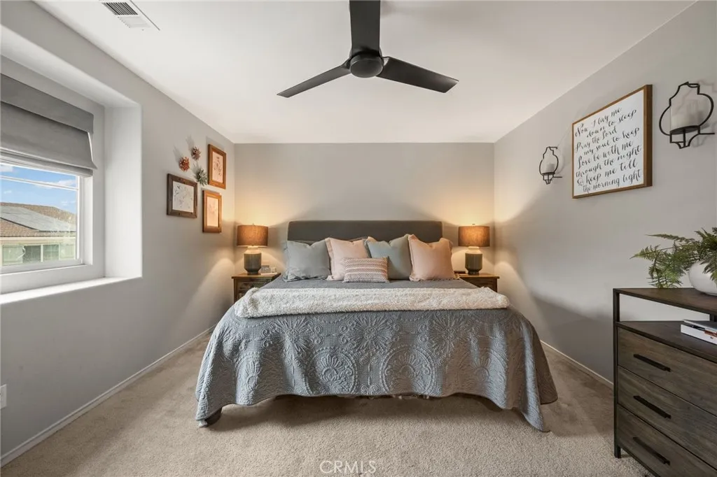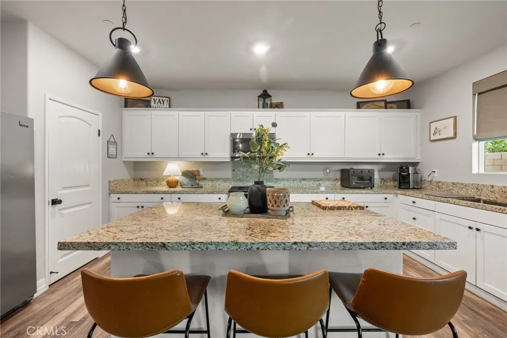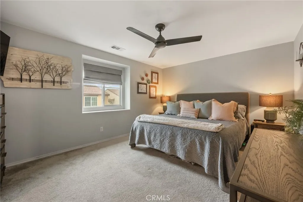 Beautiful two-story home with wonderful curb appeal and a spacious, open-concept layout. The inviting kitchen features upgraded appliances, pendant lighting, a large center island with bar seating, and opens seamlessly to the dining area and family roomcreating the perfect space for everyday living and entertaining. The thoughtfully designed floor plan includes a downstairs bedroom and full bathroom, ideal for guests, multi-generational living, or a home office. Upstairs offers a spacious loft, two additional bedrooms, a full bathroom, and a generous primary suite featuring two walk-in closets and an ensuite bath with dual sinks and a large walk-in shower. Recent improvements include upgraded flooring with new baseboards, fresh interior paint, ceiling fans throughout, SunTex window screens, upgraded kitchen appliances, and a water softener system. The backyard is designed for both relaxation and entertaining with a covered patio, extended concrete patio space, built-in fire feature, grassy yard with underground irrigation, and thoughtful landscaping. Additional highlights include owned solar, epoxy garage flooring, and garage storage. This wonderful home offers a functional floor plan, numerous upgrades, and inviting indoor-outdoor living spaces.