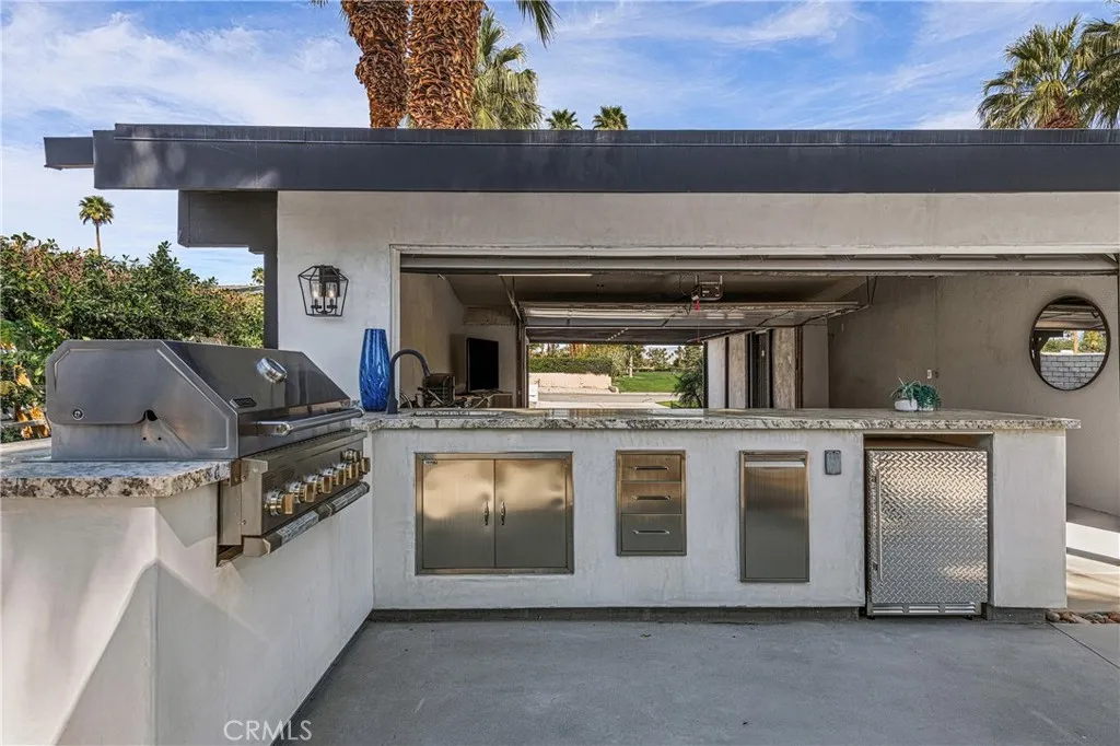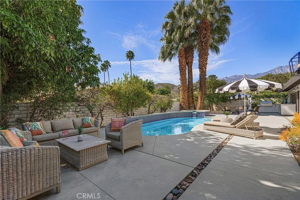 Discover timeless mid-century modern charm at 5155 East Bobolink Lane, a single-level desert retreat positioned between the 6th and 7th fairways of the Legend Course at Tahquitz Creek Golf Club. Built in 1962 and thoughtfully updated, this 4-bedroom, 3-bath home offers approximately 2,425 square feet of light-filled living with vaulted ceilings, a dual-sided vintage block fireplace, and an open chefs kitchen anchored by an oversized island and buffet with beverage fridgeideal for entertaining. The primary suite enjoys privacy and serene fairway views, a walk-in closet, and a spa-like bath with separate tub and shower. Step outside to resort-style grounds on a generous 10,454 sq ft lot: saltwater pool and spa with waterfall, new pool decking, circular fire pit, outdoor kitchen, shower, and multiple patios framed by swaying palms and mountain panoramas. Recent improvements include a new roof, updated HVAC, smooth stucco, upgraded electrical and lighting, and epoxied concrete floors, providing modern comfort with classic architectural character. With no HOA or land lease and current eligibility for a short-term rental permit, the property suits full-time residents, seasonal escapees, or investors seeking turnkey desert lifestyle income. Two-car garage, covered parking and flexible workshop/golf-cart space complete the package. Experience effortless indoor-outdoor living, dramatic views, and rare golf-course frontageschedule a private showing today and make this Palm Springs classic your own. Located minutes from downtown Palm Springs' vibrant dining, shopping and cultural scen